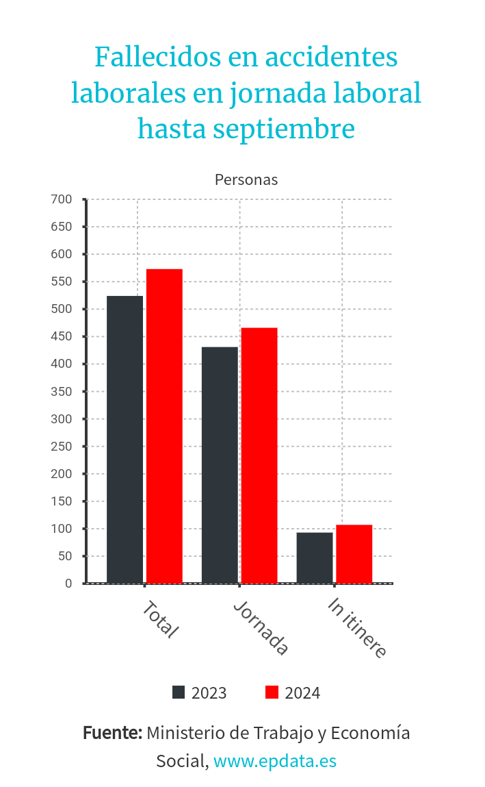 Un total de 573 trabajadores han fallecido en accidentes laborales en el Estado español en los primeros nueve meses de 2024, 49 más que en el mismo periodo de 2023, lo que supone un incremento del 9,4%, según los datos provisionales que ha publicado este miércoles el Ministerio de Trabajo y Economía Social.