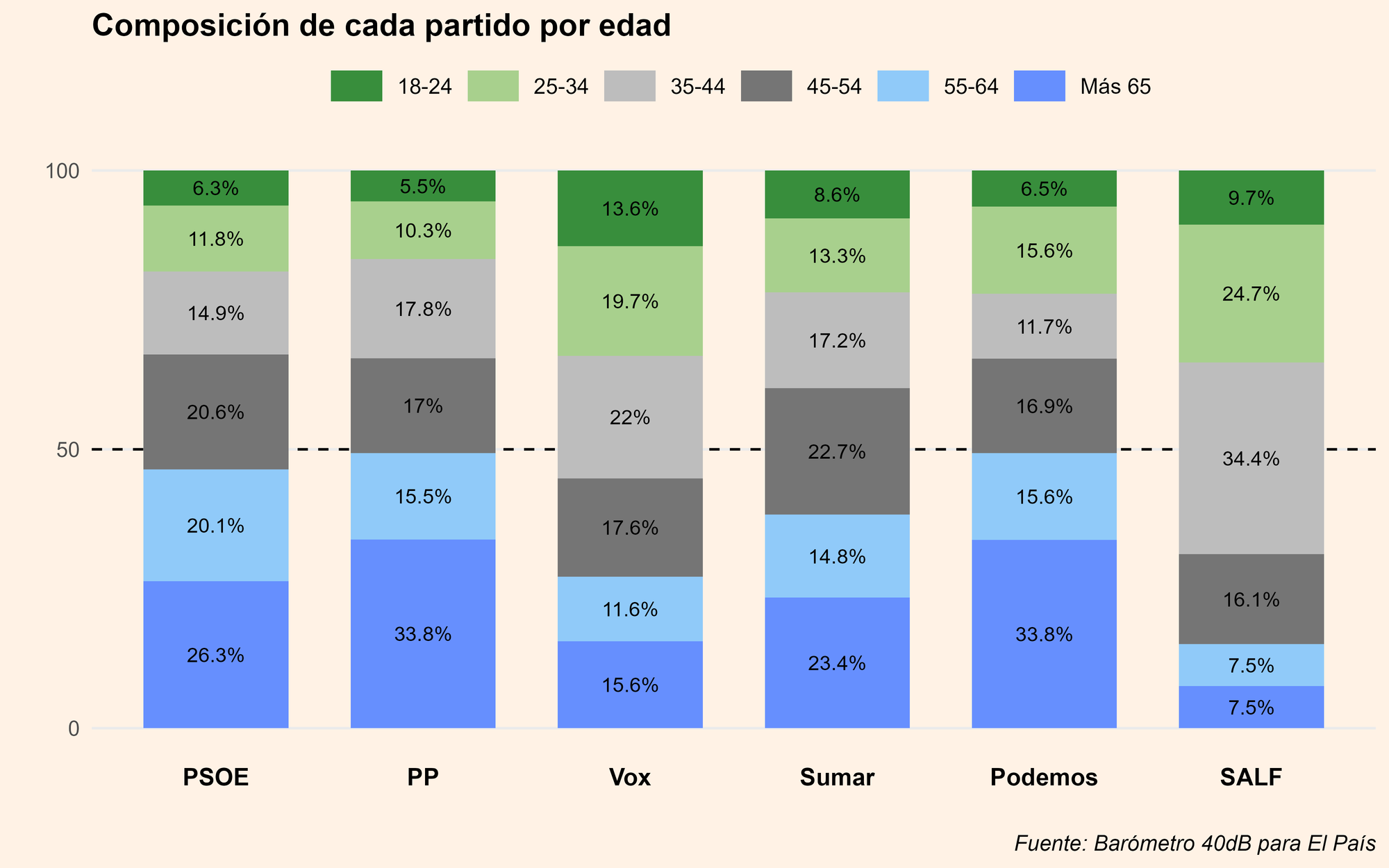 La composición de cada grupo electoral por el rango de edad es muy revelador: prácticamente la mitad del electorado del PSOE y del PP tiene más de 55 años. Solo tienen un 6,3 y un 5,5% de votantes menores de 24 años. En el otro extremo, Vox es el partido "más jóven": el 13,6% de sus electores tiene ente 18 y 24 años, otro 19,7% entre 24 y 34 y el 22% entre 35-44%. Es decir, más de la mitad de los votantes de Vox tiene menos de 44 años.