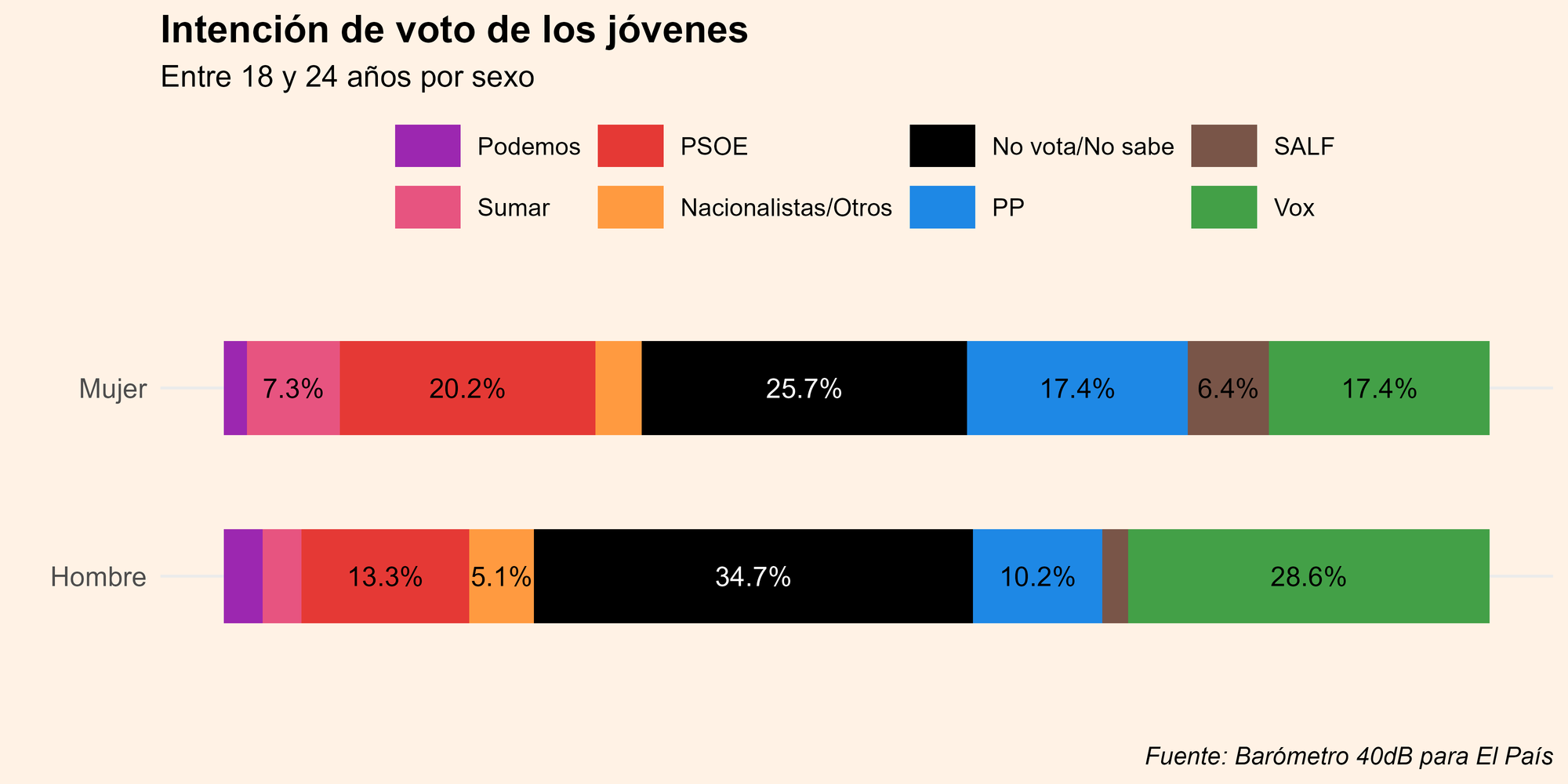 Sin embargo, Vox no es la principal opción en estas franjas de edad, sino la abstención, que va en aumento. Según el barómetro, la abstención y el "no sabe" son las respuestas más frecuentes entre los jóvenes. Un notable porcentaje de votantes de entre 18 y 34 años se sienten distantes de todos los partidos institucionales: un 30% de los jóvenes asegura que no votaría a ningún partido, no iría a votar o no lo sabe; 35% entre los hombres y un 26% de las mujeres de ese segmento de edad. Este desinterés por participar en las elecciones es un reflejo del desencanto generalizado de los jóvenes hacia el sistema político actual, en el que muchos no encuentran representación o soluciones a sus problemas cotidianos.