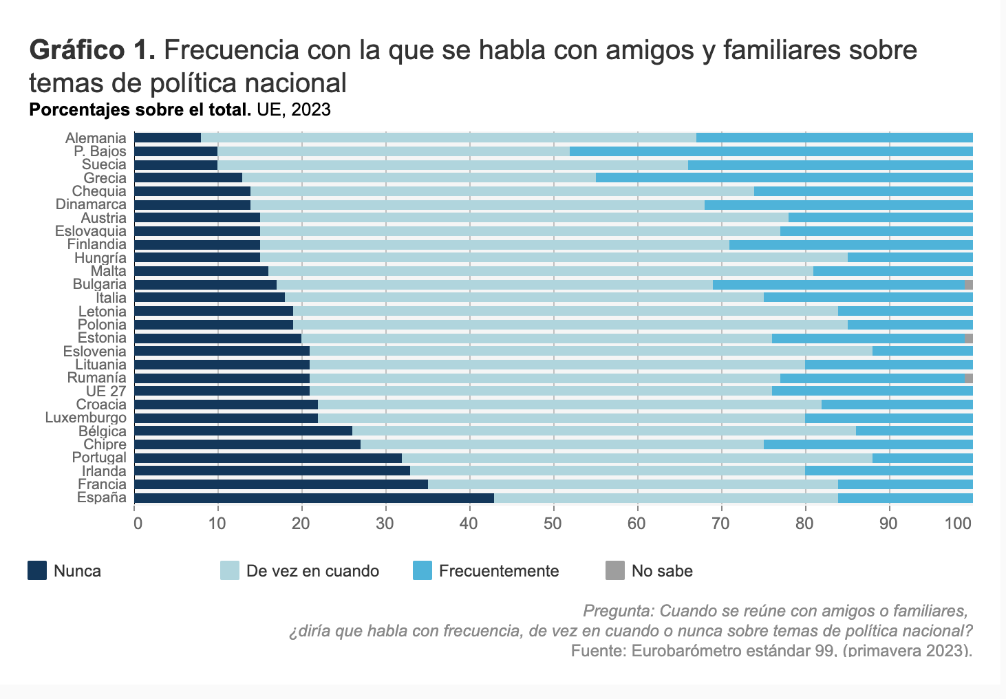 El Estado español se posiciona como el miembro de la Unión Europea con la mayor proporción de personas que no conversan nunca sobre política estatal o local con familiares y amigos. Según los datos del último Eurobarómetro estándar, publicado en julio de 2023, un 43% de la población del Estado español admite evitar este tipo de debates.