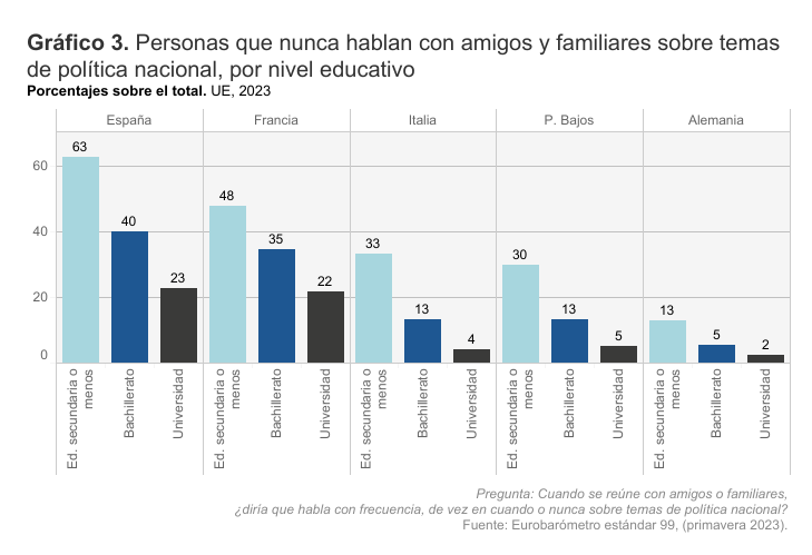 No obstante, el vínculo entre nivel educativo y predisposición al diálogo político no ha dado lugar a una mejora gradual. A pesar de los avances en la formación de la población en las últimas décadas, los datos muestran que la proporción de personas en el Estado español que nunca discuten sobre política no ha disminuido. Desde 2010, el país ha mantenido cifras por encima de la media europea, y desde 2020, esta tendencia incluso ha ido al alza.