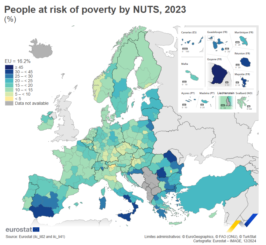 La desigualdad regional sigue marcando diferencias significativas, donde territorios como Andalucía presentan tasas de pobreza similares a los de los territorios de ultramar del Estado francés, el norte y el sur de Rumanía y el sur de Italia.
