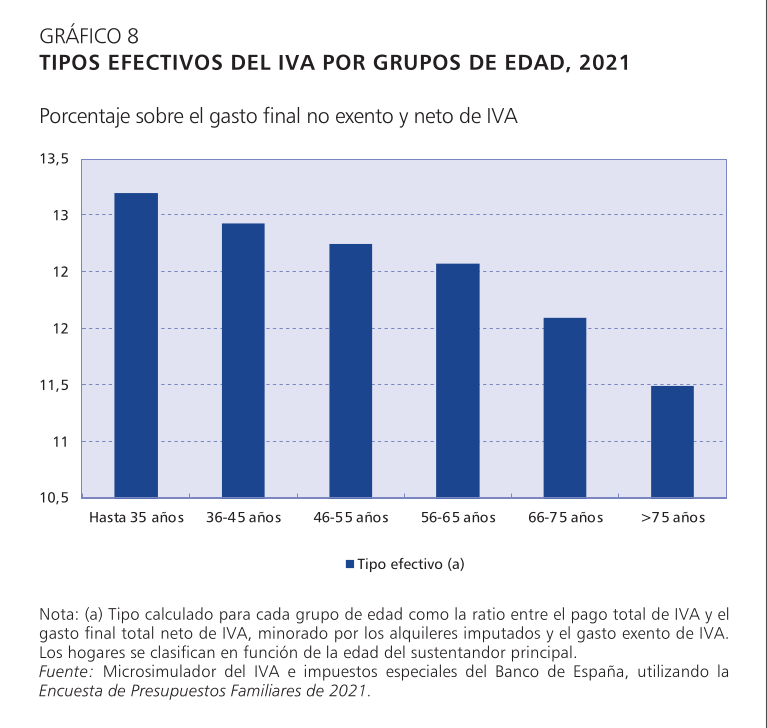 En segundo lugar, la teoría del ciclo vital sugiere que las decisiones sobre el consumo, el ahorro y la inversión cambian según la edad. Los jóvenes tienden a endeudarse, los adultos ahorran y los jubilados utilizan ese ahorro para mantener su nivel de vida. Este patrón también impacta los impuestos sobre el consumo y la inversión, ya que los tipos impositivos varían dependiendo de la edad y los comportamientos económicos de los hogares. Además, la acumulación de bienes inmuebles entre las personas mayores y los cambios en sus patrones de consumo (por ejemplo, en productos y servicios) pueden afectar los impuestos indirectos, como el IVA. Los hogares mayores tienden a consumir productos gravados con tipos impositivos más bajos, como alimentos y servicios sanitarios, lo que reduce el tipo efectivo sobre el consumo. Esta evolución del patrón de consumo de los hogares, con un desplazamiento hacia bienes con menores tipos impositivos, podría generar una pérdida en la recaudación de impuestos sobre el consumo. Esto se ve reflejado en la menor contribución de los hogares mayores a impuestos especiales, como los de hidrocarburos o vehículos. Aunque el envejecimiento podría aumentar el consumo agregado debido a un mayor consumo por jubilación, la evidencia internacional muestra una disminución del consumo post-jubilación, lo que podría agravar la erosión de la base impositiva. En el Estado español, este fenómeno ya está impactando en la recaudación del IVA, que es más baja en comparación con la media de la UE-27, lo que plantea desafíos adicionales para la sostenibilidad del sistema fiscal.