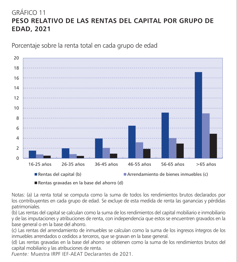 Este proceso también está vinculado a una mayor concentración de las rentas del capital entre los hogares de mayor edad. Mientras que 2002 los jóvenes tenían el 7,5% de la riqueza en el Estado español, en 2022 no llegaban al 2%. En 2002, los mayores de 75 tenían el 8% de la riqueza en España, en 2022, el 20%. En 2022, los hogares con una persona de referencia mayor de 65 años poseían más del 40% de la riqueza neta total. Esta concentración se refleja en el predominio de la propiedad inmobiliaria como principal componente de la riqueza, especialmente en los hogares mayores, que también tienen carteras de activos más diversificadas. Los expertos advieren que esta concentración de la riqueza y las rentas del capital en los hogares de mayor edad podría reducir la recaudación impositiva, especialmente si los tipos impositivos son bajos para estos rendimientos.
