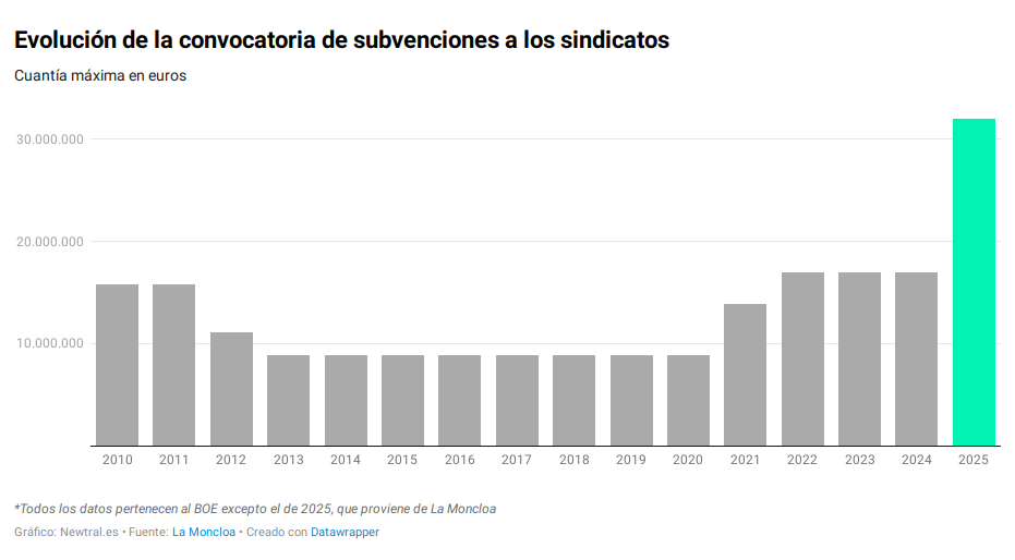Casi se duplican las subvenciones a los sindicatos, alcanzando los 32 millones de euros en 2025