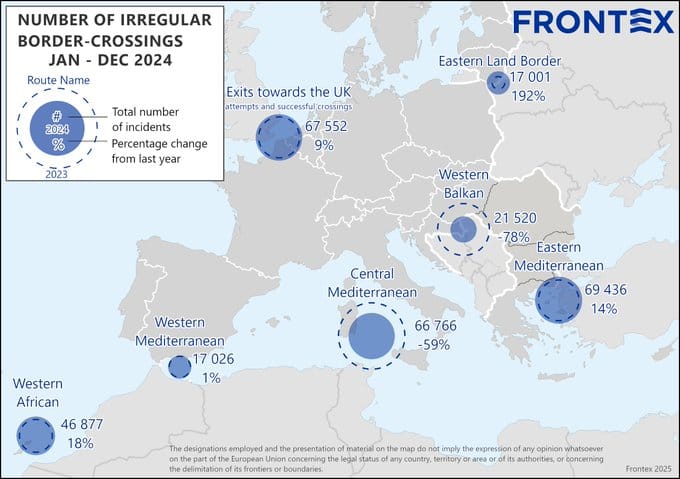 La mayor disminución en los cruces irregulares se observó en las rutas del Mediterráneo Central y los Balcanes Occidentales, con caídas del 59% y el 78%, respectivamente. Sin embargo, como demuestran los estudios científicos, los flujos migratorios se pueden modificar, postergar y desplazar, pero no se pueden suprimir: mientras el flujo se redujo en ciertos corredores, en otros como el del Mediterráneo Oriental, se experimentaron un aumento en los cruces. De hecho, la migración desde África Occidental alcanzó cifras récord: un aumento un 18% respecto a 2023.