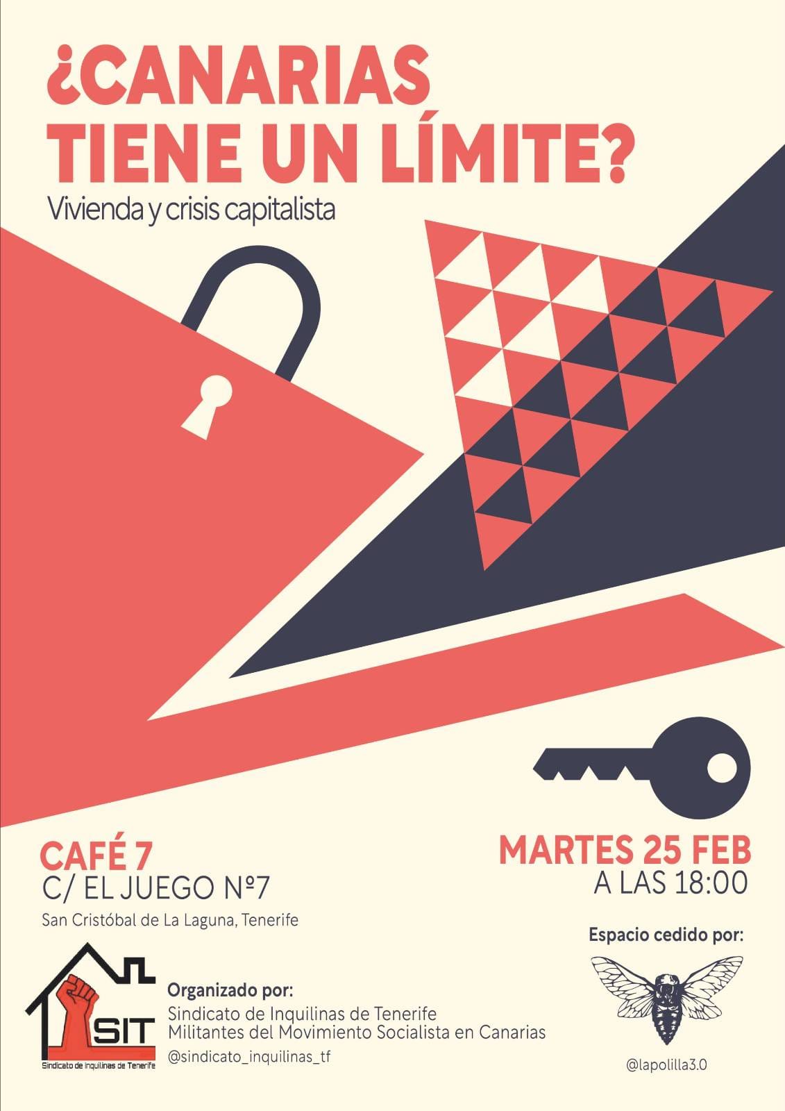 El Sindicato de Inquilinas de Tenerife y Militantes del Movimiento Socialista en Canarias han organizado una charla bajo el título ¿Canarias tiene un límite? Vivienda y crisis capitalista, para el próximo martes 25 de febrero. El evento se celebrará a las 18:00 en San Cristobal de la Laguna (Tenerife), en Café 7 de la calle El Juego número 7.