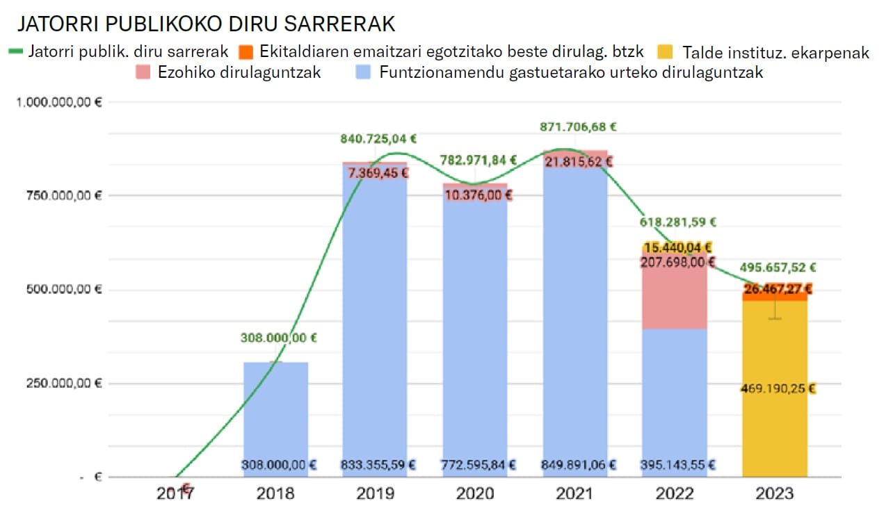 Se observa que entre los años 2017 y 2023 la organización ha percibido 3.917.342,67 euros de origen público y otros 9.247.038,18 clasificados como de origen privado, dejando de lado saldos positivos provenientes de las enajenaciones patrimoniales o de carácter excepcional, que son tratados de manera diferenciada. Se deducen por tanto un total de 13.164.380,85 euros en ingresos limpios referidos estrictamente a la actividad ordinaria en el periodo estudiado, con una proporción de aproximadamente el 30% de dinero público y 70% proveniente de ingresos privados.