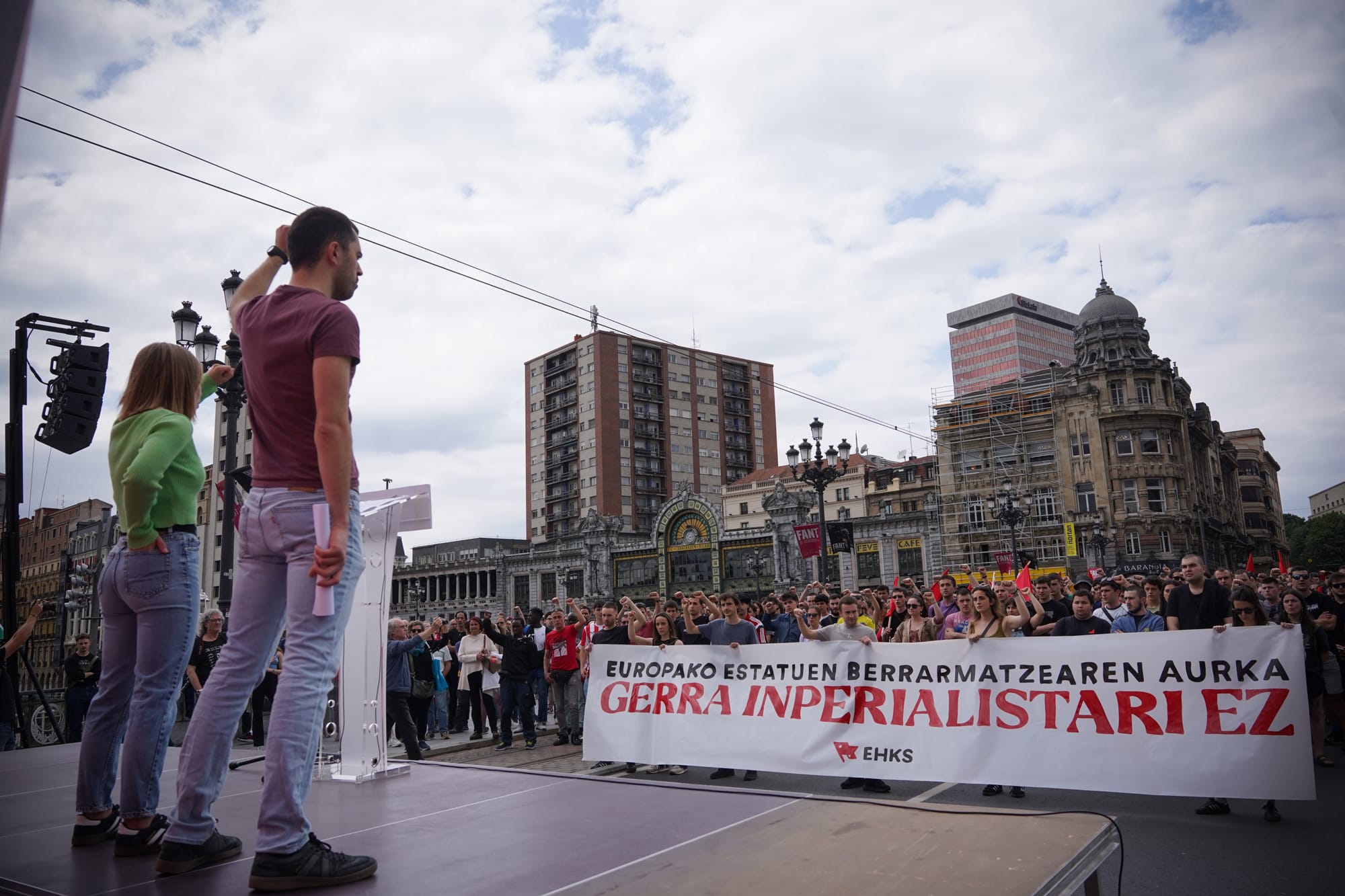 Garazi Navarro, en nombre de EHKS, ha añadido que, con la excusa de la guerra, los estados de la Unión Europea están impulsando políticas autoritarias: “Aunque tiene un apoyo popular dudoso, Macron quiere liderar un plan nuclear; Sánchez ha incrementado el gasto sin pasar por su congreso, o en Alemania, han cambiado la constitución de un día para otro”.
