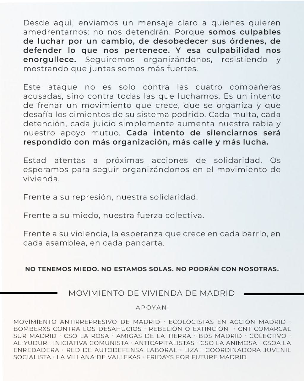 El comunicado ha sido firmado por numerosos movimientos sociales, organizaciones y espacios. “Cada intento de silenciarnos será respondido con más organización, más calle y más lucha”, concluye el texto. El Movimiento de Vivienda llama a “seguir organizándonos en el movimiento de vivienda” y advierte que “no nos detendrán”.