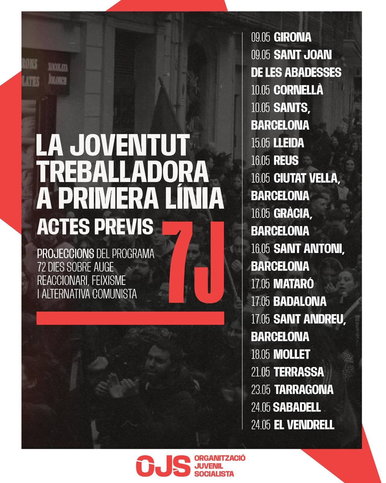 La Organització Juvenil Socialista (OJS) de Catalunya ha convocado una manifestación para el próximo 7 de junio en Badalona bajo el lema La juventud trabajadora en primera línea.
