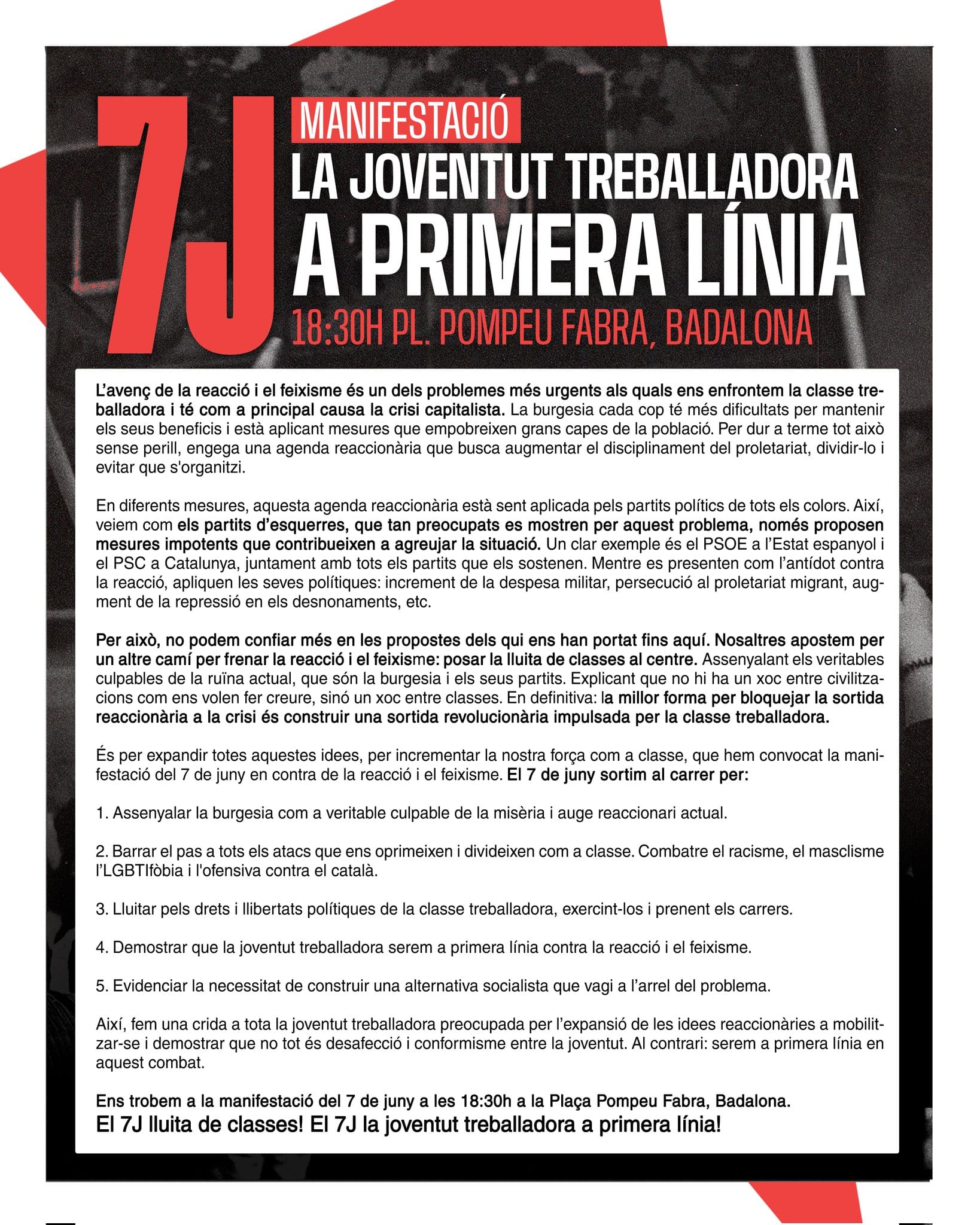 Según el comunicado difundido por la organización en sus redes sociales, el objetivo de la protesta es denunciar el avance de la reacción y el fascismo y señalar como responsables a la burguesía y sus partidos. La cita está prevista a las 18:30 h en la Plaça Pompeu Fabra.