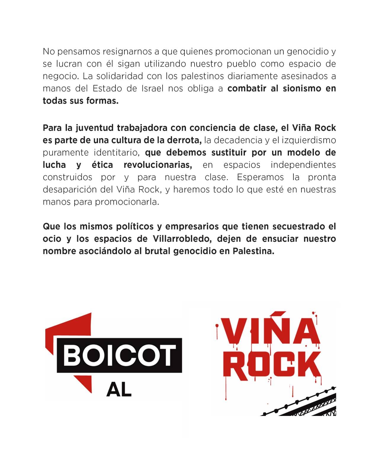 El comunicado concluye que “la solidaridad con los palestinos diariamente asesinados a manos del Estado de Israel nos obliga a combatir al sionismo en todas sus formas” y llama a “la pronta desaparición del Viña Rock”, instando a construir “espacios independientes desde la lucha y la ética revolucionarias”.