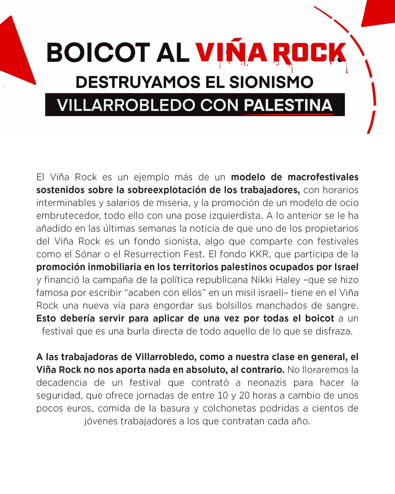 La Coordinadora Juvenil Socialista (CJS) de Albacete y un grupo de jóvenes trabajadores de Villarrobledo han anunciado el inicio de una campaña de boicot contra el festival Viña Rock, señalando que uno de los propietarios del Viña Rock es un fondo sionista, en referencia a KKR, y denunciando condiciones laborales de sobreexplotación que padecen los trabajadores del festival.