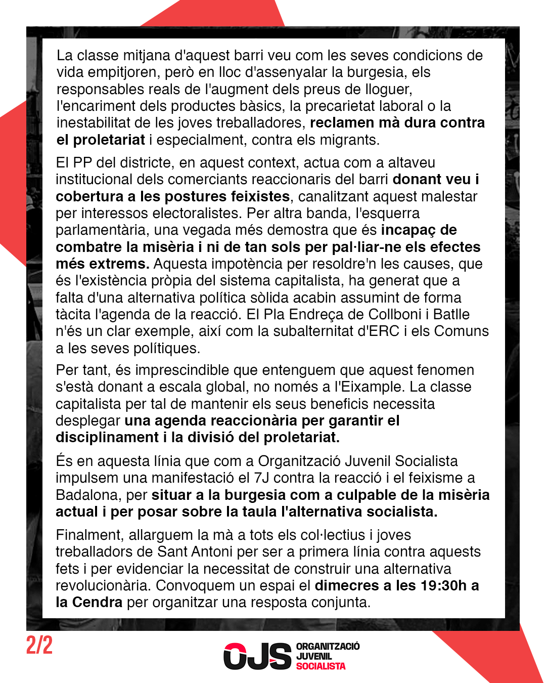 Ante esta situación, la OJS convoca una manifestación el próximo 7 de junio en Badalona contra la reacción y el fascismo y hace un llamamiento a los colectivos y jóvenes trabajadores de Sant Antoni para organizar una respuesta conjunta.