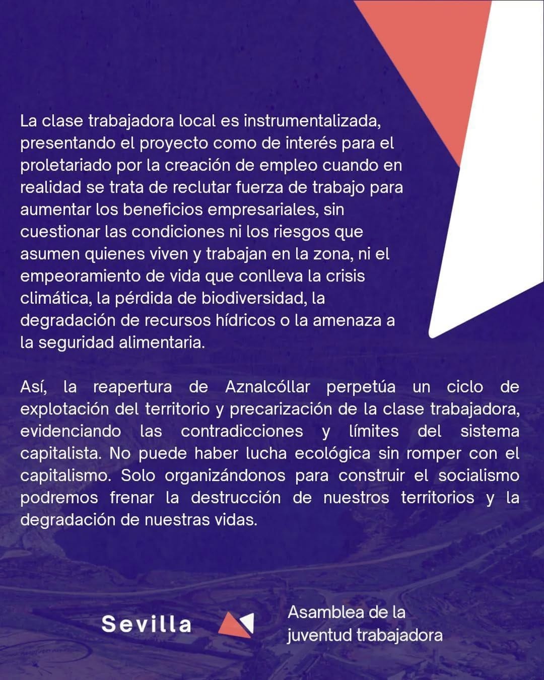 La AJT Sevilla denuncia que la reapertura de la mina responde a intereses empresariales y de grandes fondos de inversión, y que el discurso de la "creación de empleo" se utiliza para justificar un modelo extractivista que, según la AJT, “perpetúa la precarización de la clase trabajadora y la degradación ambiental”.