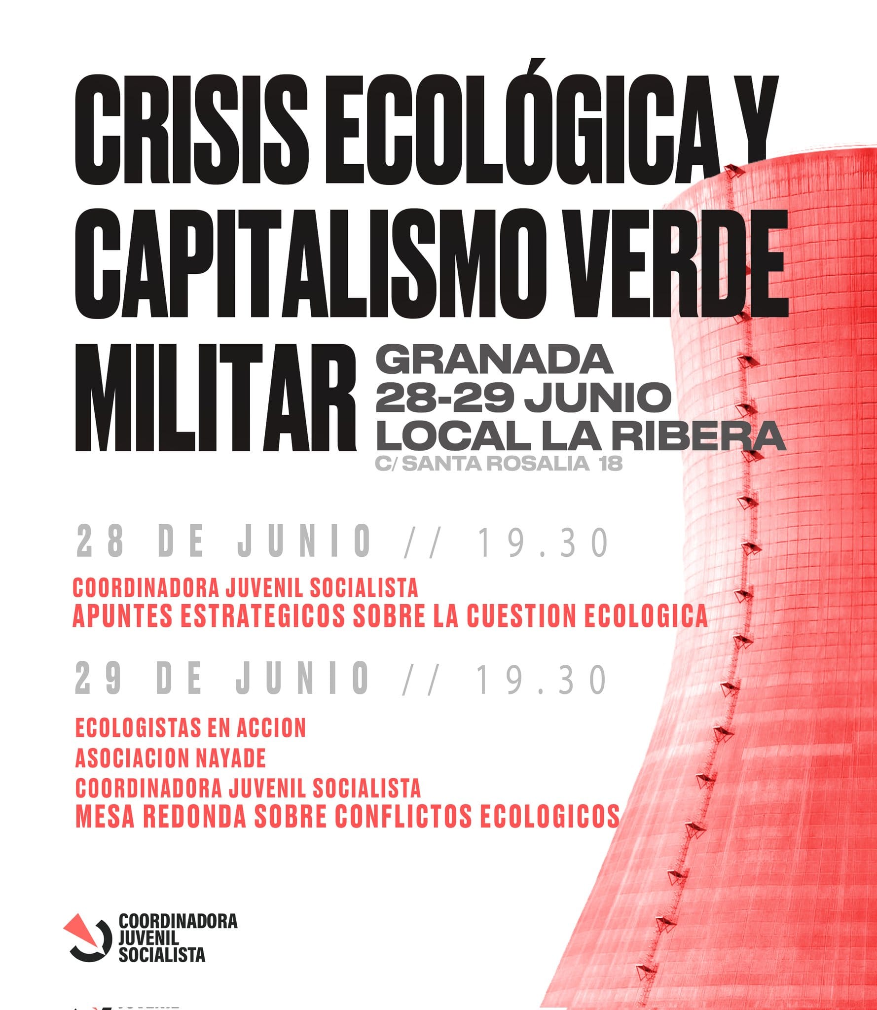 La Coordinadora Juvenil Socialista (CJS) de Granada convoca los días 28 y 29 de junio unas jornadas bajo el título Crisis ecológica y capitalismo verde militar, concepto que alude a la convergencia entre las políticas de transición energética y el refuerzo de la industria militar y fronteriza en la Unión Europea. Las actividades tendrán lugar a las 19:30 en el local La Ribera, en la calle Santa Rosalía 18, en el barrio del Zaidín.