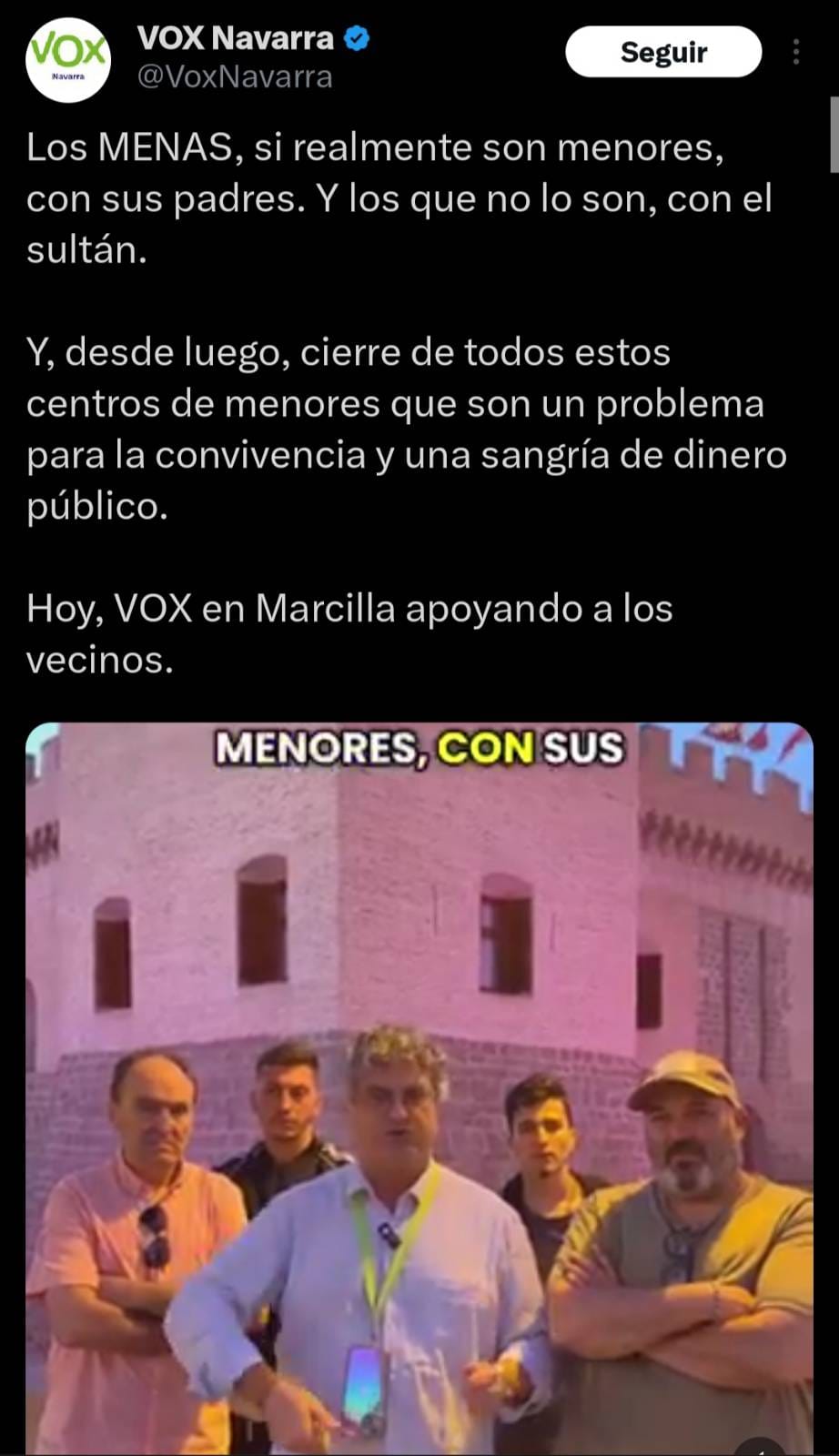 Como ocurre en otros lugares, grupos fascistas están interviniendo en Marcilla y aprovechando la situación para difundir mensajes de odio racista e incitar a la violencia entre los vecinos. Vox y Núcleo Nacional ya han hecho acto de presencia. Vox Navarra publicó el domingo en la red social X que participó en la manifestación de Marcilla “a favor del cierre del centro de MENAS”.