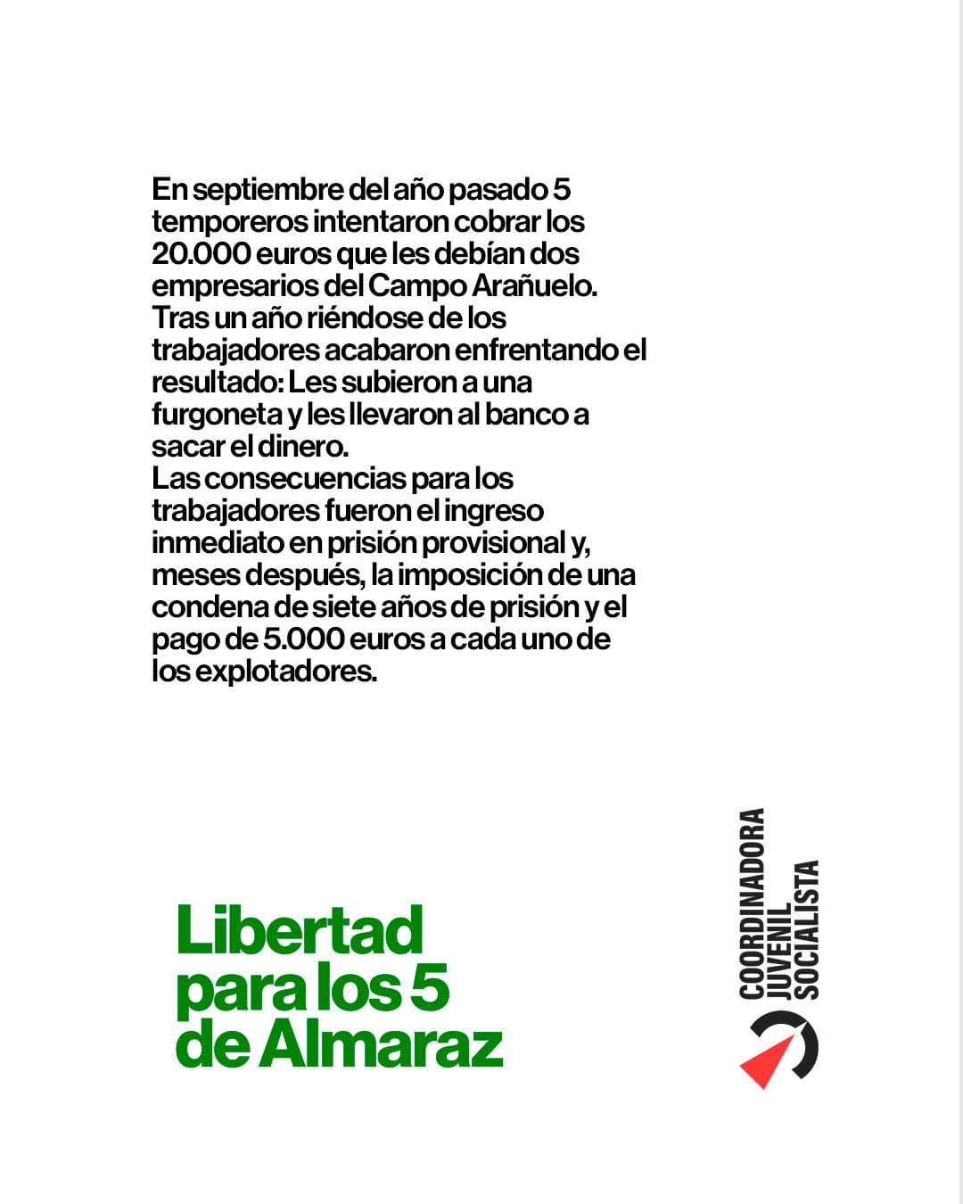 Ante esta situación, la organización juvenil del Movimiento Socialista ha lanzado la campaña Libertad para los 5 de Almaraz, reclamando la excarcelación de los trabajadores y denunciando públicamente la criminalización de la protesta obrera y migrante.