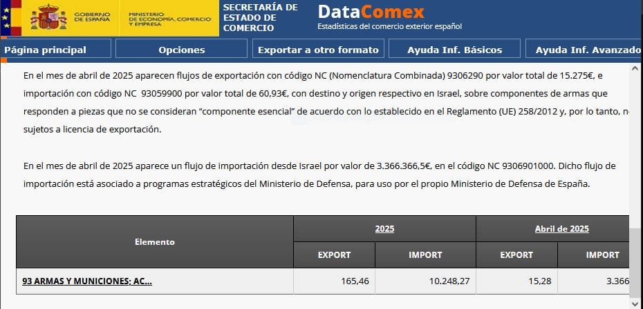 Las estadísticas oficiales del portal DataComex, dependiente de la Secretaría de Estado de Comercio, vuelven a poner en evidencia las mentiras del Gobierno español respecto a la compraventa de armas con el Estado de Israel: en abril de 2025 Madrid importó bombas y municiones de guerra del Estado de Israel por un precio superior a 3,3 millones de euros, destinadas a programas del Ministerio de Defensa.