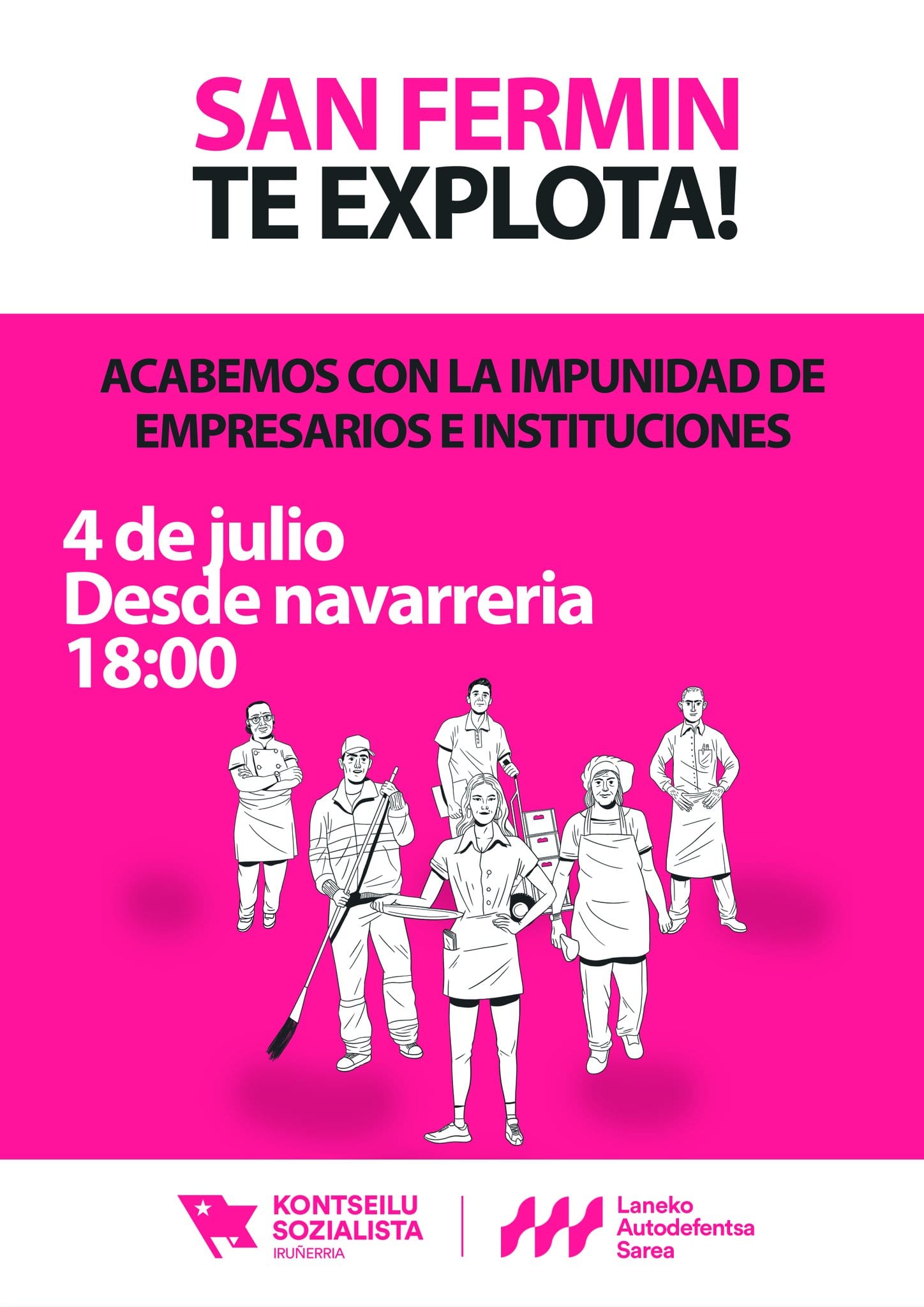 Desde hace varios años, la Red de Autodefensa Laboral de Iruñerria (RAL) organiza una movilización en vísperas de las fiestas de San Fermín en Iruñea (Nafarroa), en denuncia de la impunidad de empresarios y entidades públicas. Este año, RAL ha difundido la convocatoria bajo el lema “¡San Fermín te explota!”: la manifestación será el 4 de julio a las 18:00 horas, comenzando en Nabarreria.