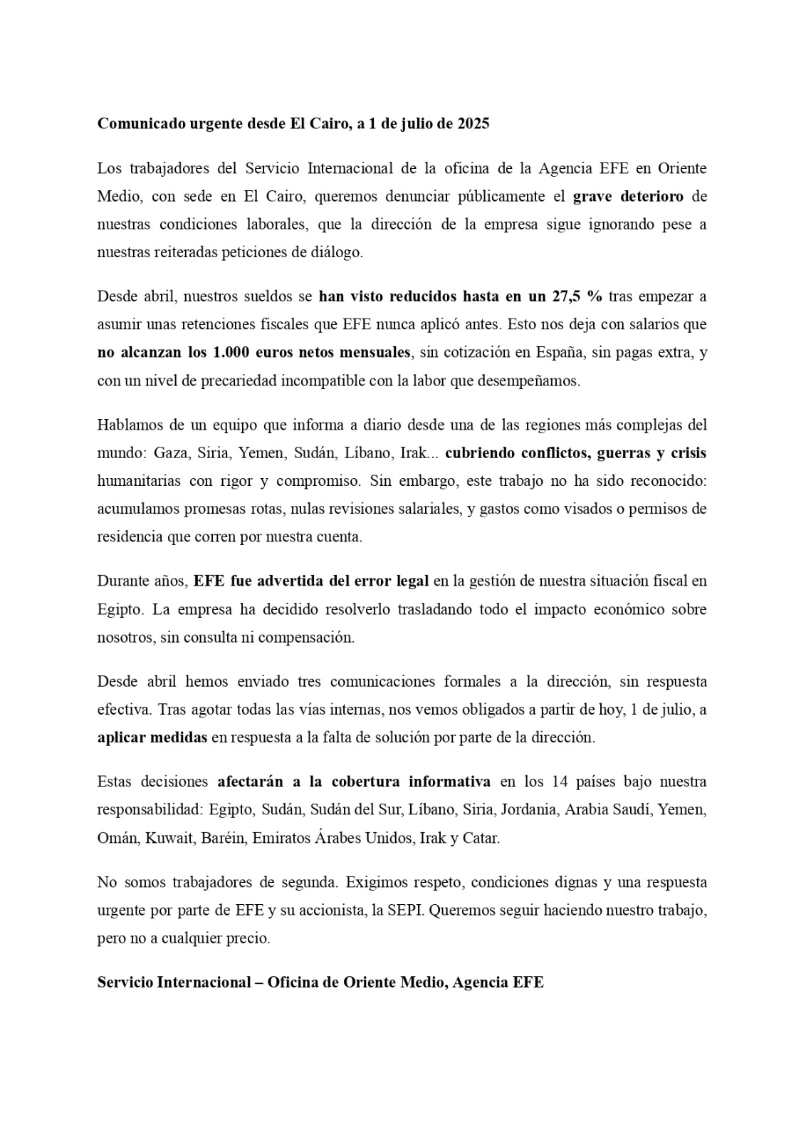 El equipo, que cubre la actualidad de 14 países de la región —incluidos Gaza, Siria, Yemen, Sudán, Líbano e Irak—, denuncia que la empresa ha trasladado el impacto económico del cambio fiscal directamente sobre la plantilla, sin consulta ni compensación, pese a haber sido advertida durante años del error legal en la gestión de su situación fiscal en Egipto.
