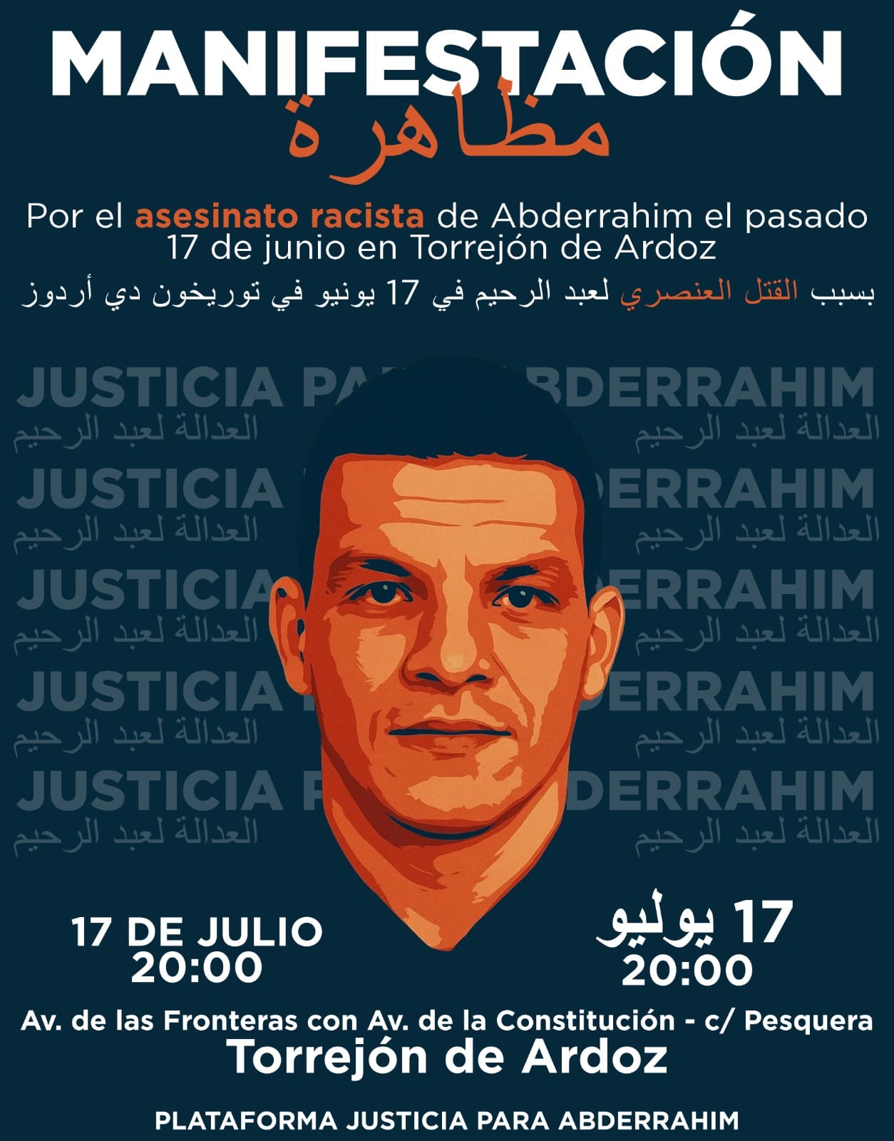 La plataforma Justicia para Abderrahim, creada por vecinos y organizaciones sociales y políticas, ha convocado una manifestación para el 17 de julio en Torrejón, cuando se cumplirá un mes del violento asesinato, para exigir verdad, justicia y la entrega inmediata del cuerpo de la víctima.