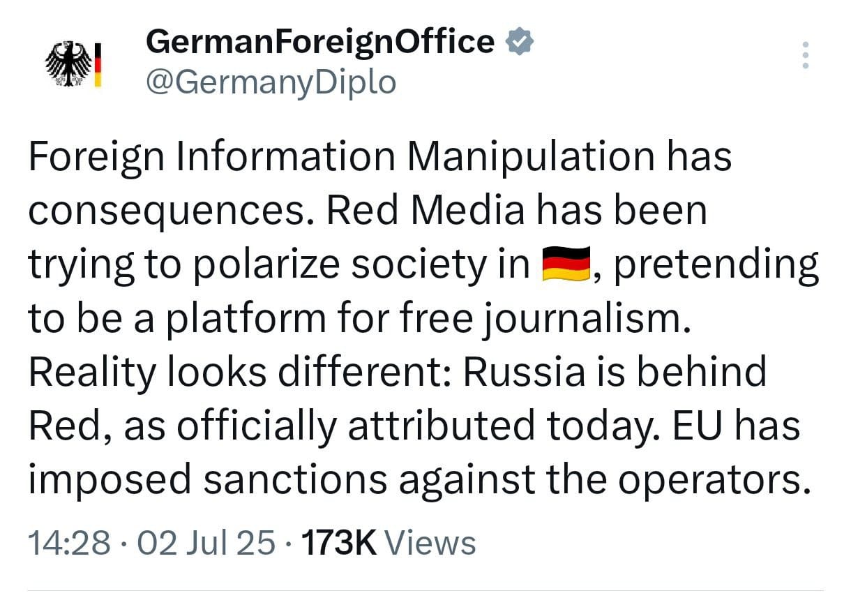 El Gobierno alemán, a través de su cuenta oficial @GermanyDiplo, ha declarado públicamente que “Rusia está detrás de Red Media, como se ha atribuido oficialmente hoy”, y ha justificado las sanciones afirmando que la plataforma “ha intentado polarizar la sociedad, pretendiendo ser un medio de periodismo libre”.