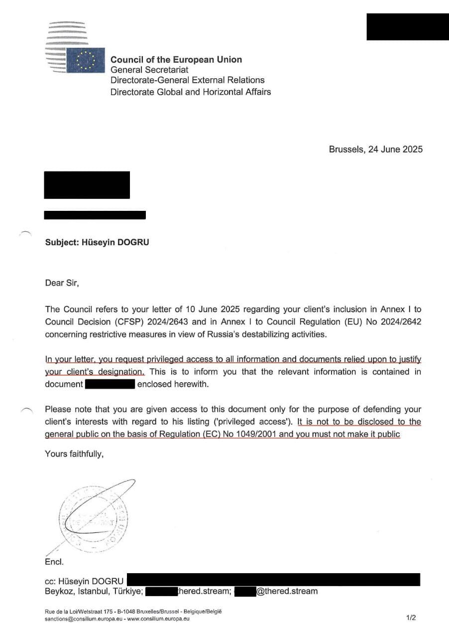 El Consejo de la Unión Europea, en una carta fechada el 24 de junio de 2025 y dirigida a los representantes legales de Dogru, confirma que el expediente "está a disposición del afectado solo para su defensa y que no puede hacerse público en virtud del Reglamento (EC) No 1049/2001".