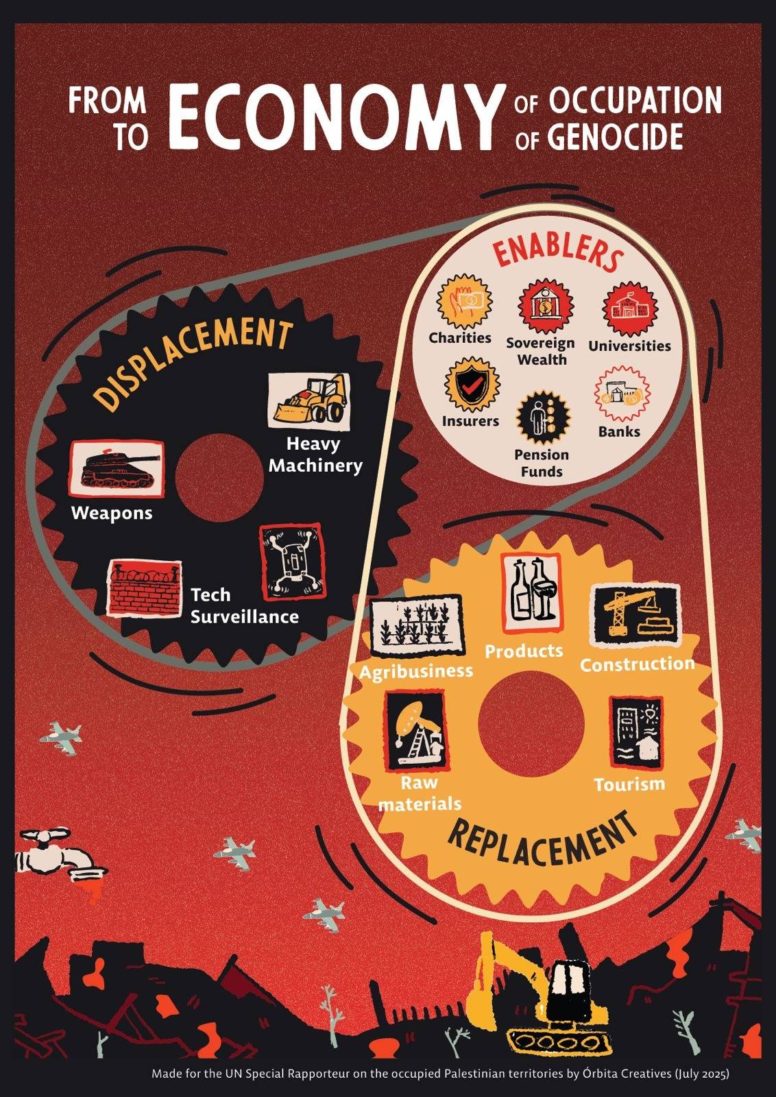 El informe subraya que la ocupación, el asedio y el genocidio de Gaza no solo continúan por razones políticas, sino porque “son lucrativos para muchos”, y reclama "una respuesta diplomática y legal firme" ante uno de los genocidios más documentados de la historia reciente.