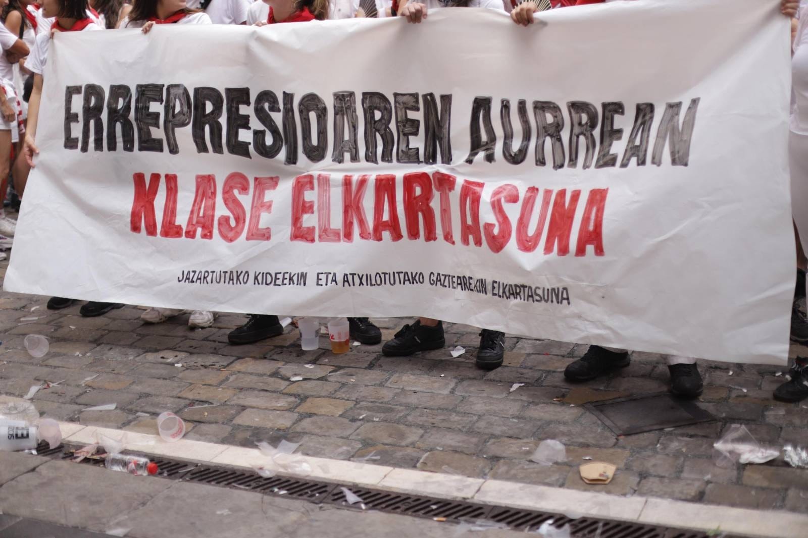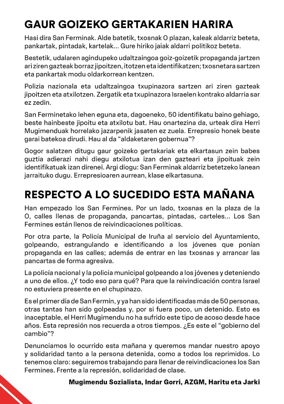 Según explicaron en la concentración, en el primer día de Sanfermines hubo “más de 50 identificados, otros tantos golpeados y un detenido”, todo ello relacionado con la colocación de propaganda política y la realización de consignas políticas. “Esto es inaceptable. Hacía años que el movimiento popular no sufría una persecución así”, han denunciado el Movimiento Socialista, Indar Gorri, Alde Zaharreko Gazte Mugimendua, Haritu y Jarki: “Esa represión parece de otra época. ¿Es este el gobierno del cambio?”.