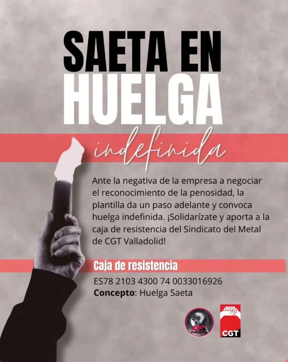 Trabajadores de Saeta Die Casting, en Valladolid (Castilla y León), mantienen una huelga indefinida para denunciar las graves condiciones laborales que sufren en la planta y reclamar mejoras urgentes. El paro, convocado ante los reiterados incumplimientos de la empresa, busca visibilizar tanto los riesgos físicos como psicológicos a los que se enfrentan a diario.