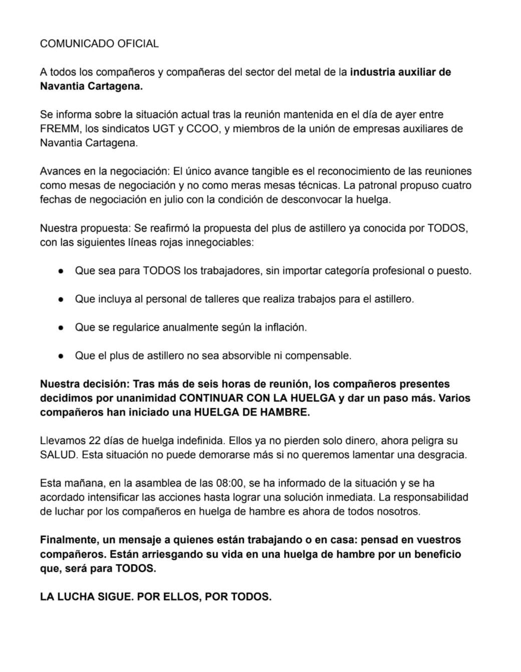 Al menos una veintena de trabajadores de las empresas auxiliares de Navantia en Cartagena (Región de Murica) ha iniciado una huelga de hambre y una acampada en la Plaza Castellini de tras rechazar la última propuesta de la mesa del metal, que condicionaba cualquier avance a la desconvocatoria inmediata de la huelga.