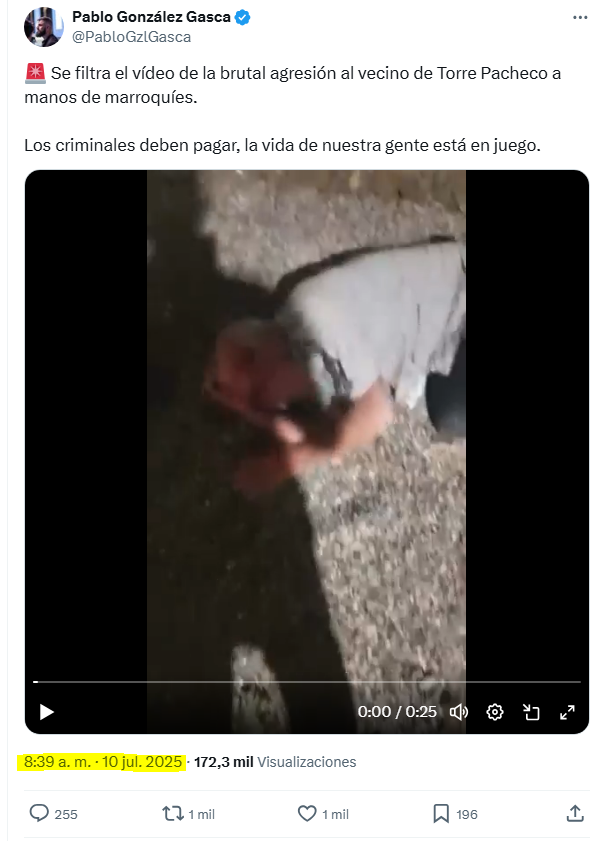 La primera persona qué publicó el vídeo en redes sociales bajo el contexto falsificado fue el responsable de marketing digital de Vox, Pablo González Gasca, enlace con grupos neonazis que fomentaron el linchamiento racista desde Telegram y líder de Revuelta.