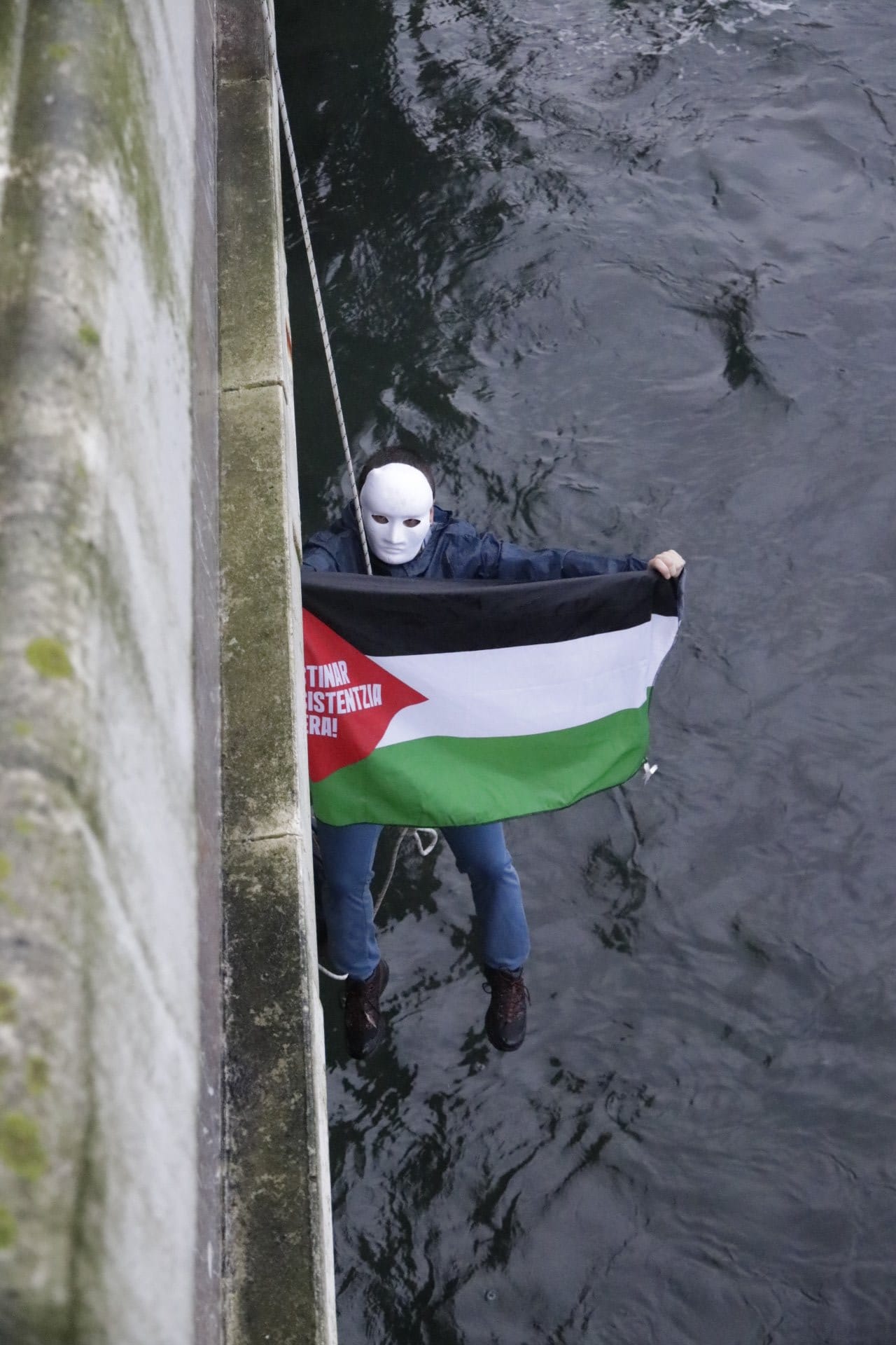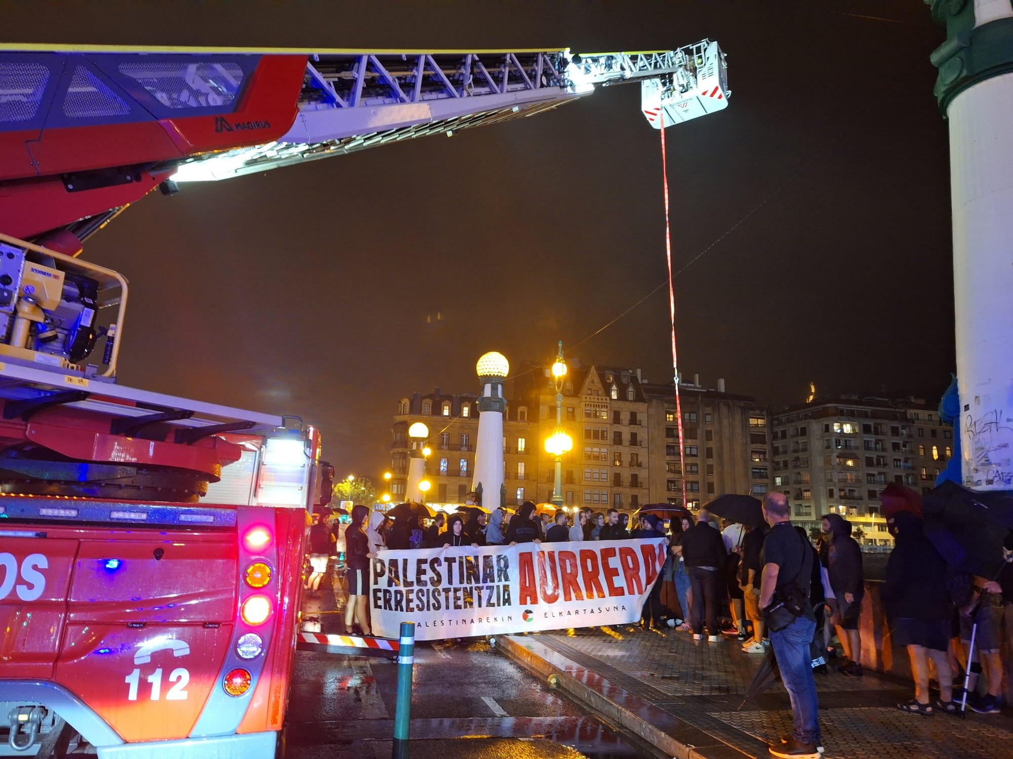 Dos personas se colgaron del puente de la Zurriola en la manifestación organizada por Palestinarekin Elkartasuna en pleno festival de cine de Donostia.