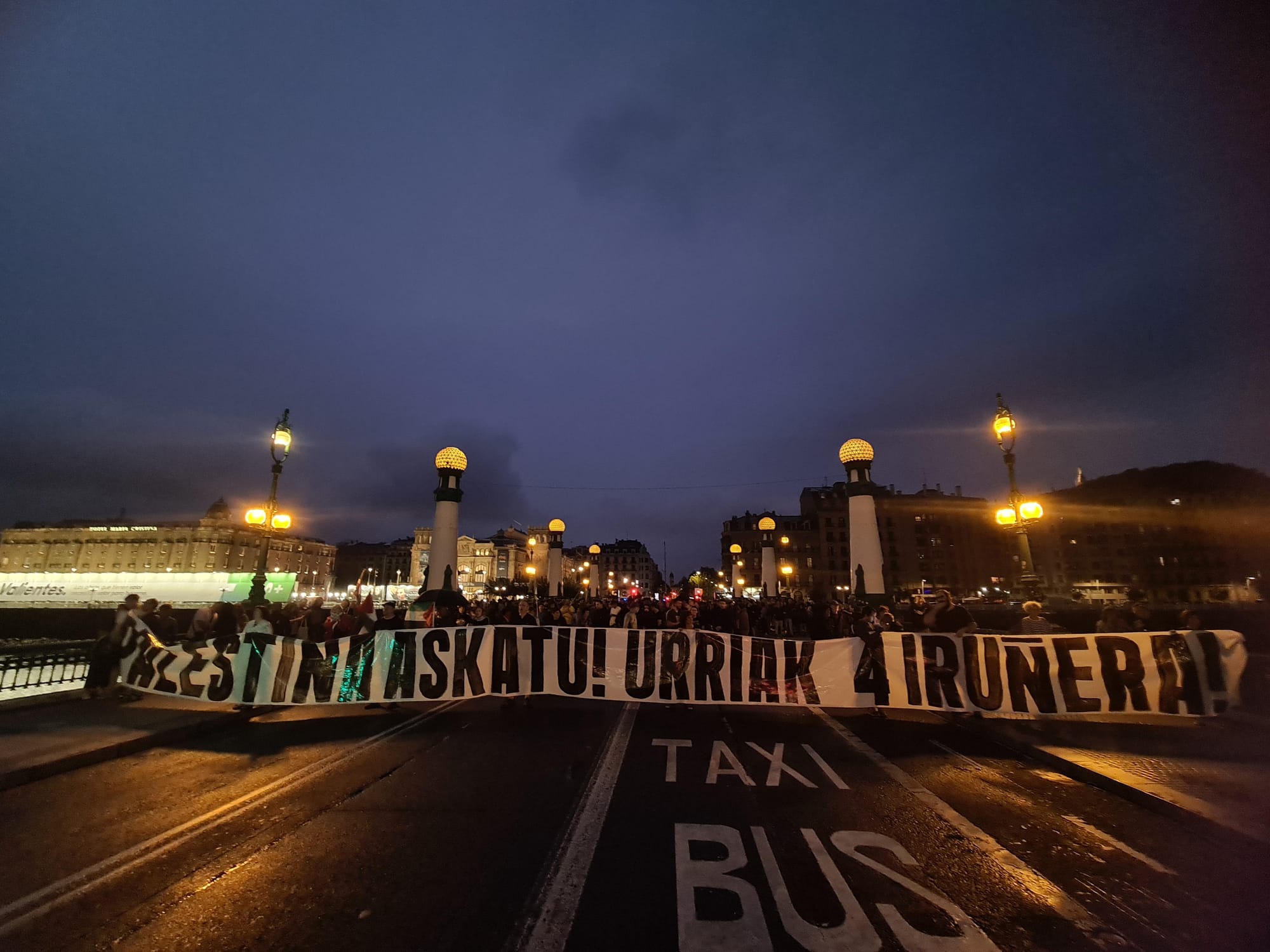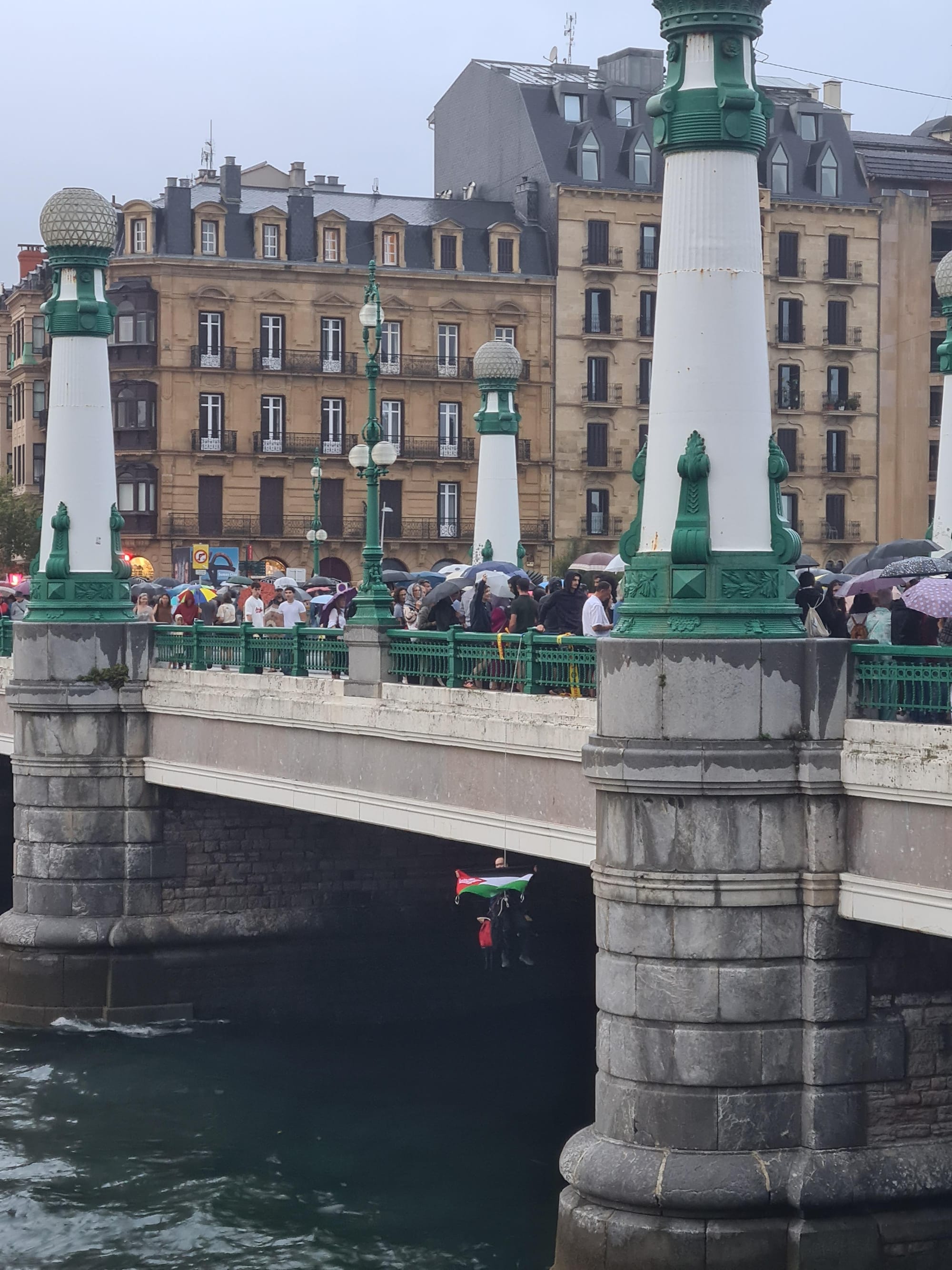 El pasado sábado, la plataforma Palestinarekin Elkartasuna organizó dos multitudinarias movilizaciones a favor de la resistencia palestina y contra el Estado genocida de Israel. En pleno Festival de Cine, tuvo lugar una manifestación en Donostia la tarde del día 20: partió de Sagüés y pasó por el Kursaal, y al llegar al puente de la Zurriola, dos personas se colgaron de él con banderas en apoyo a la resistencia palestina.