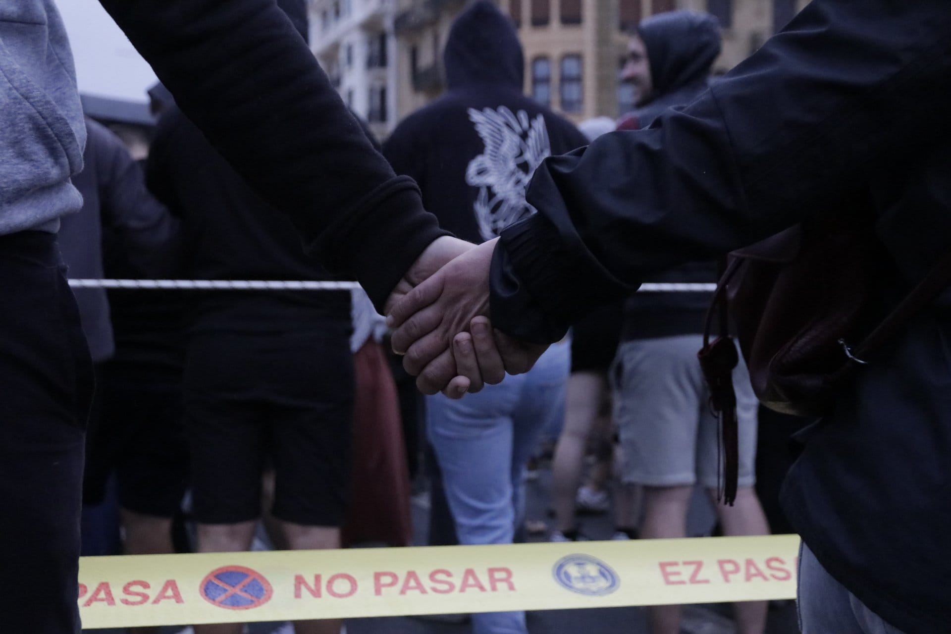 Mientras tanto, numerosos agentes de la Ertzaintza se concentraron en los alrededores del Kursaal con material antidisturbios. Una vez finalizada la acción en el puente, los manifestantes se dirigieron hacia la Parte Vieja, donde volvieron a corear consignas a favor de la libertad de Palestina.
