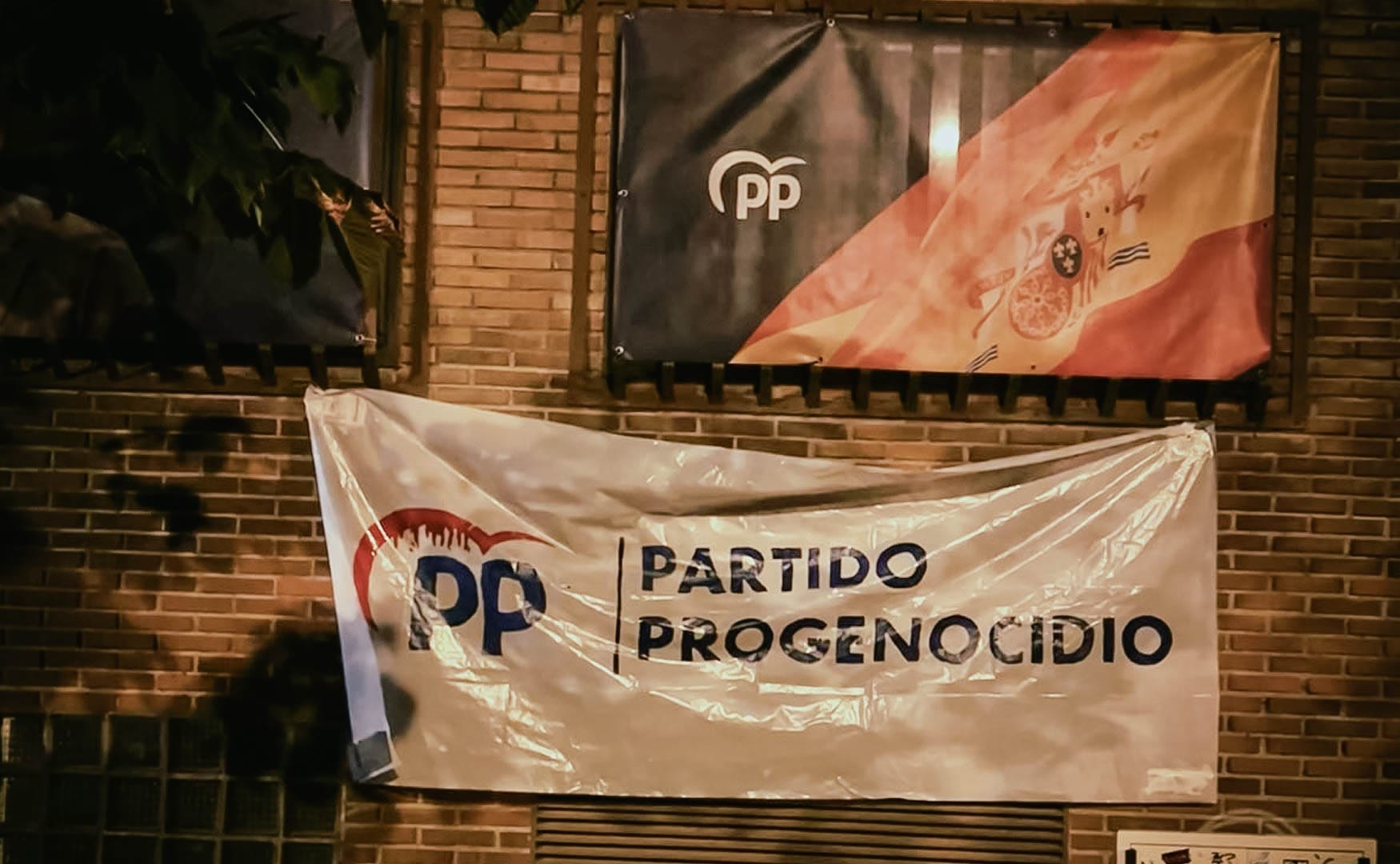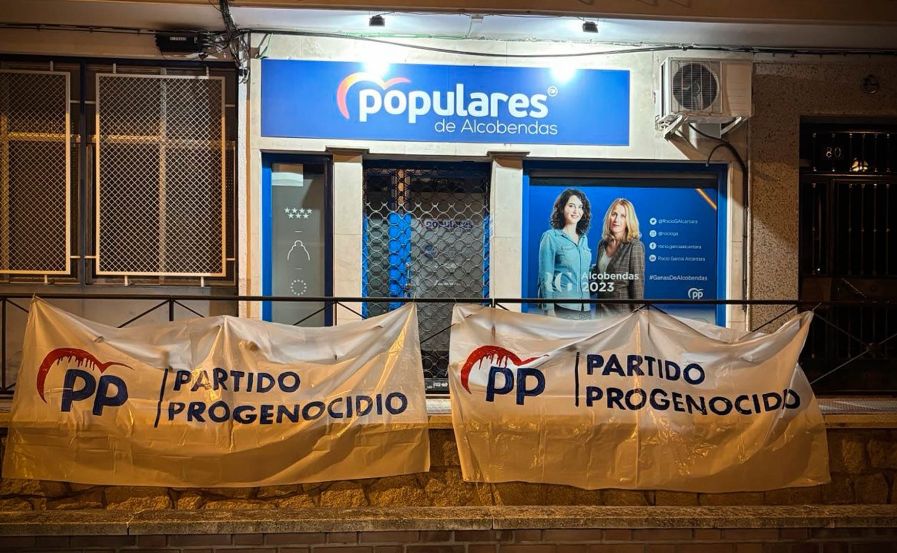Este martes, 30 de septiembre, la Coordinadora Juvenil Socialista (CJS) de Madrid ha publicado en redes sociales varias imágenes de sedes del Partido Popular con varias pancartas desplegadas, que rezaban Partido Progenocidio. La CJS apunta al PP, y especialmente al Gobierno de la Comunidad de Madrid encabezado por Isabel Díaz Ayuso, "por su apoyo al Estado genocida de Israel y su criminalización de la solidaridad con Palestina".
