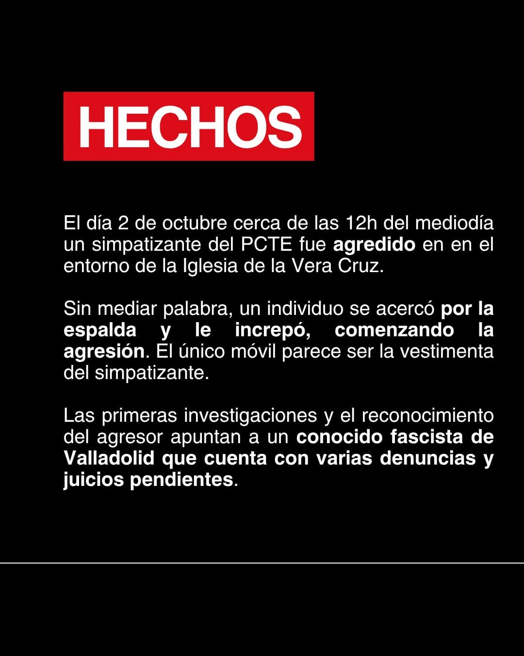 Un simpatizante del Partido Comunista de los Trabajadores de España (PCTE) fue agredido el pasado 2 de octubre, alrededor de las 12:00 del mediodía, en las inmediaciones de la Iglesia de la Vera Cruz, en Valladolid (Castilla y León). Según ha denunciado la organización en redes sociales, el ataque se produjo sin mediar palabra, cuando un individuo se acercó por la espalda e inició la agresión, aparentemente motivado por la vestimenta del simpatizante.