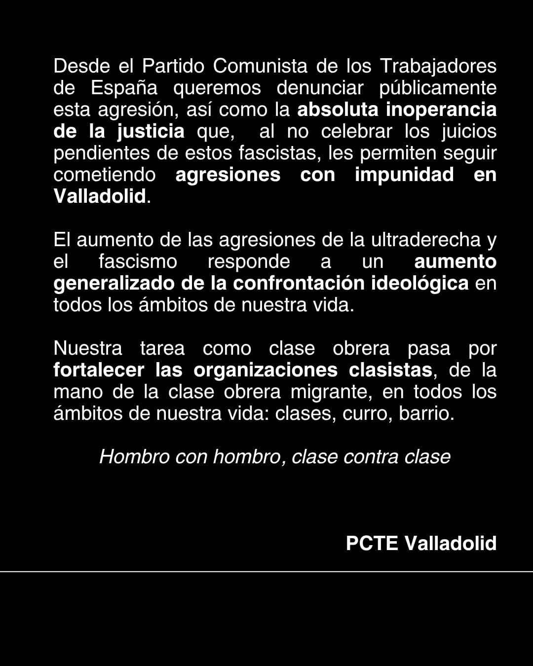 “El crecimiento de las agresiones fascistas evidencia la necesidad de una respuesta organizada de la clase trabajadora”, señalan desde la sección vallisoletana del PCTE, que llama a actuar “hombro con hombro, clase contra clase” frente a la violencia y la impunidad fascista.
