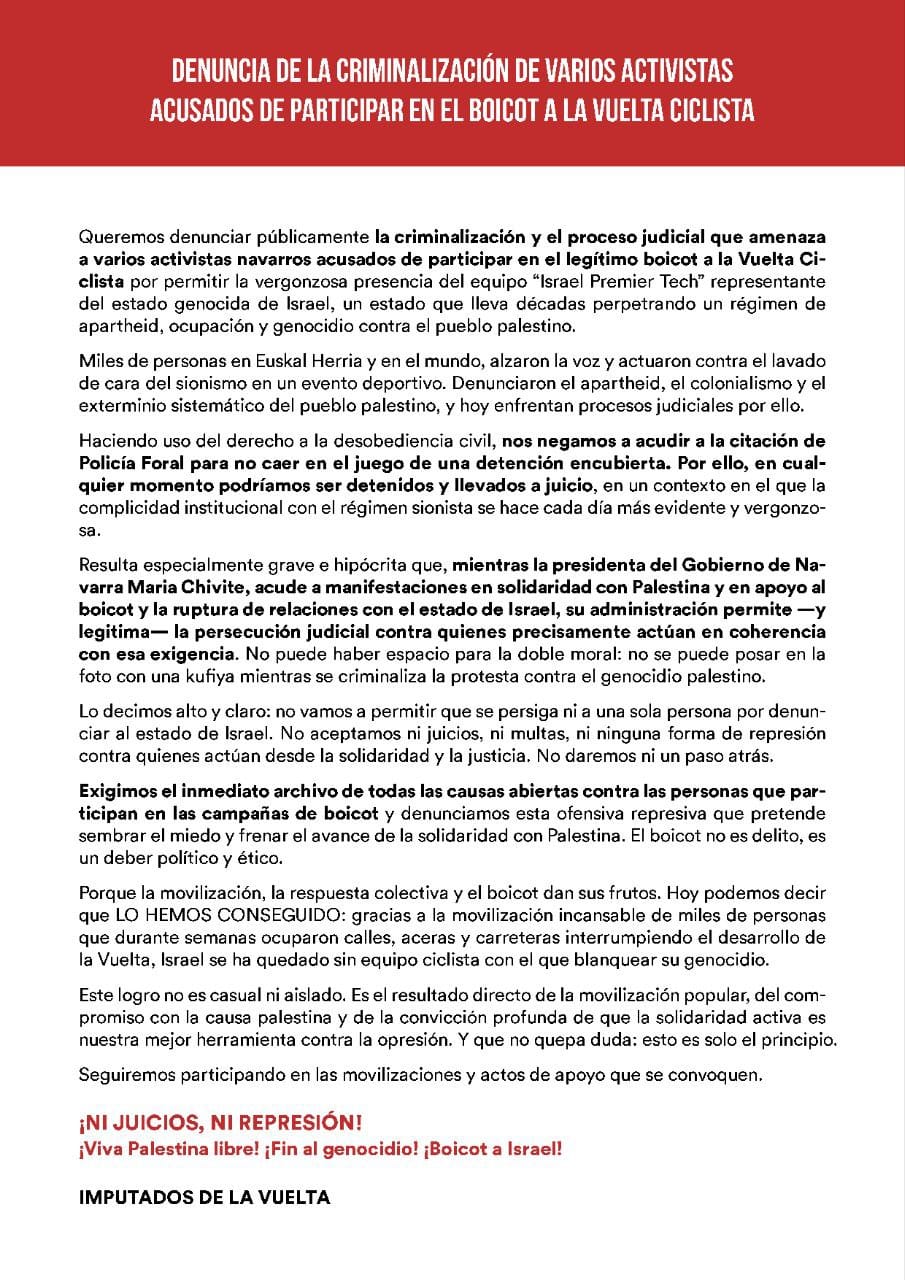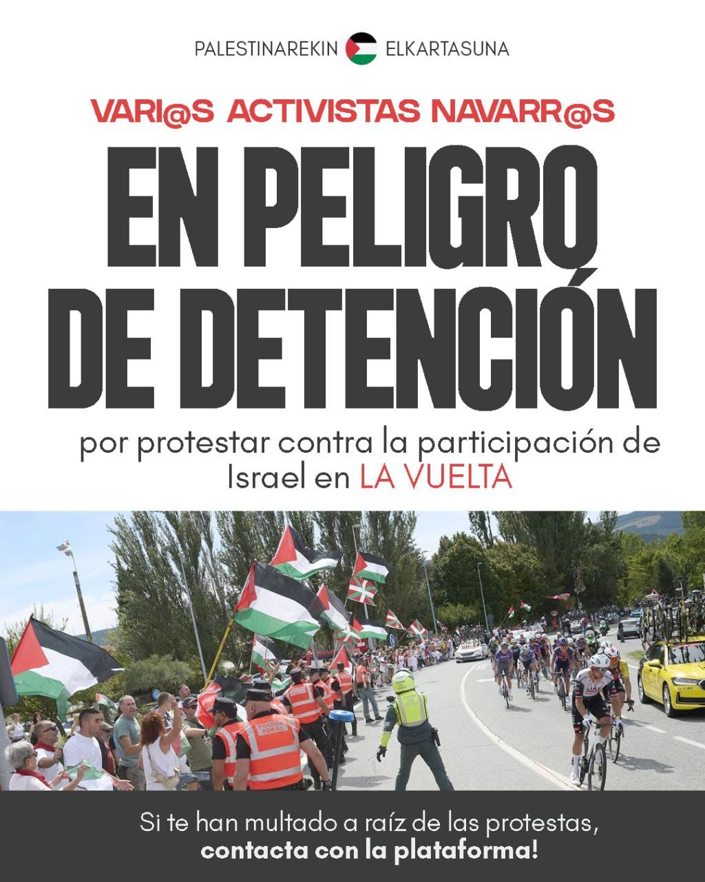 Es posible que, en Nafarroa (Euskal Herria), varias personas estén en riesgo de ser detenidas por haber participado en las movilizaciones contra la Vuelta. La Palestinarekin Elkartasuna y BDZ de Nafarroa han lanzado la advertencia: con motivo de las protestas contra la empresa israelí Premier Tech, la Policía Foral ha citado a varias personas a declarar. Sin embargo, estas personas se han negado a aceptar la citación. Por ello, podrían estar en riesgo de ser detenidas en cualquier momento.
