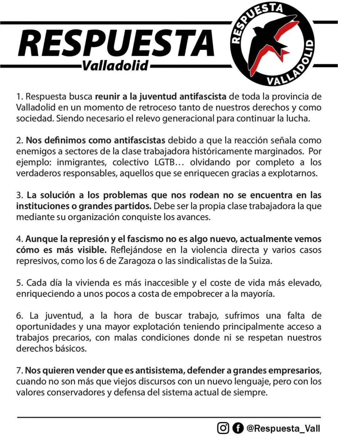 Respuesta-Valladolid ha anunciado su creación con el objetivo de “reunir a la juventud antifascista de toda la provincia de Valladolid en un momento de retroceso tanto de nuestros derechos como de la sociedad”, según ha comunicado la propia organización a través de su cuenta de instagram. La agrupación sostiene que “es necesario el relevo generacional para continuar la lucha” y se define como antifascista porque, afirman, “la reacción señala como enemigos a sectores de la clase trabajadora históricamente marginados, como inmigrantes o el colectivo LGTB, olvidando a los verdaderos responsables, aquellos que se enriquecen gracias a explotarnos”.