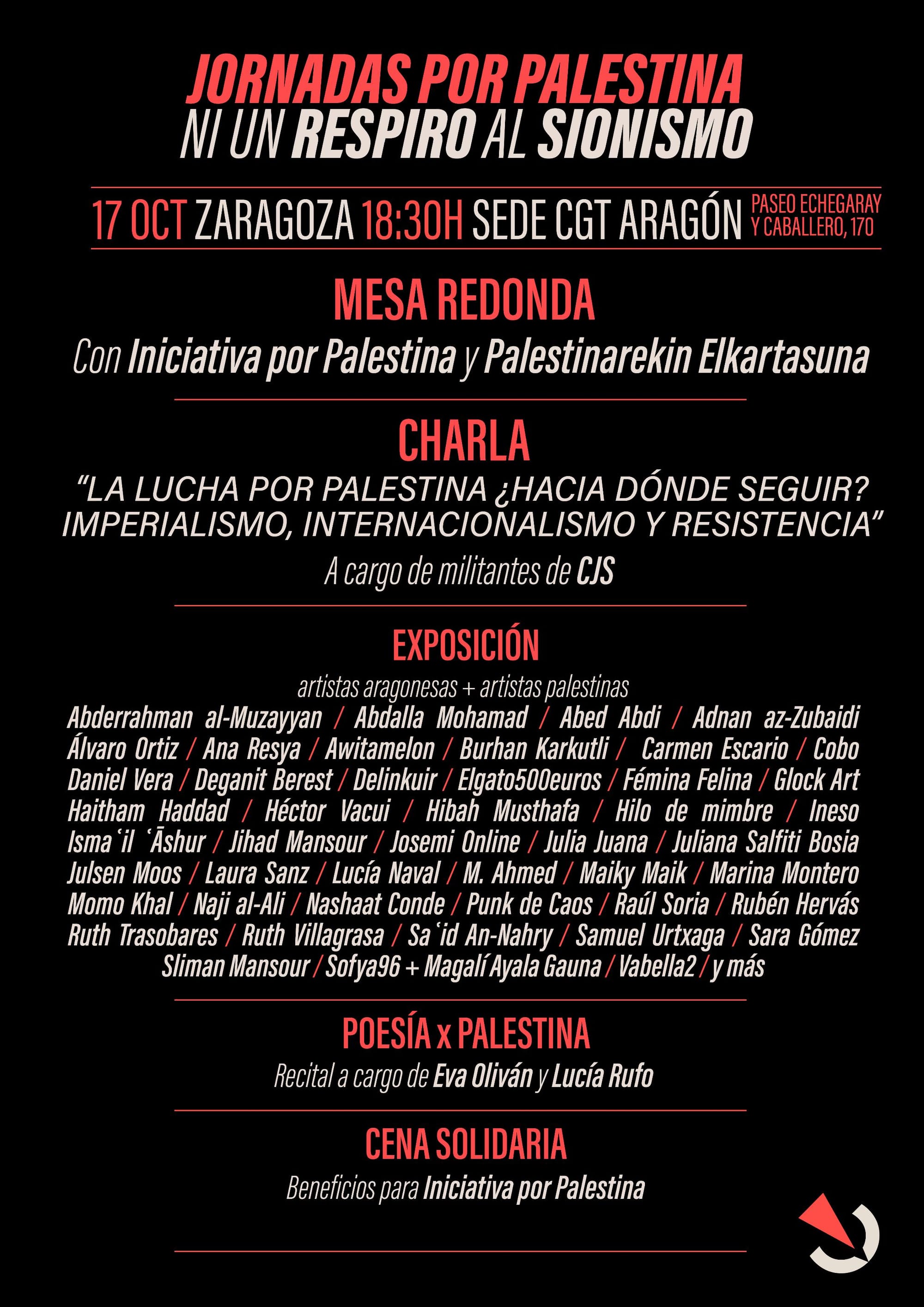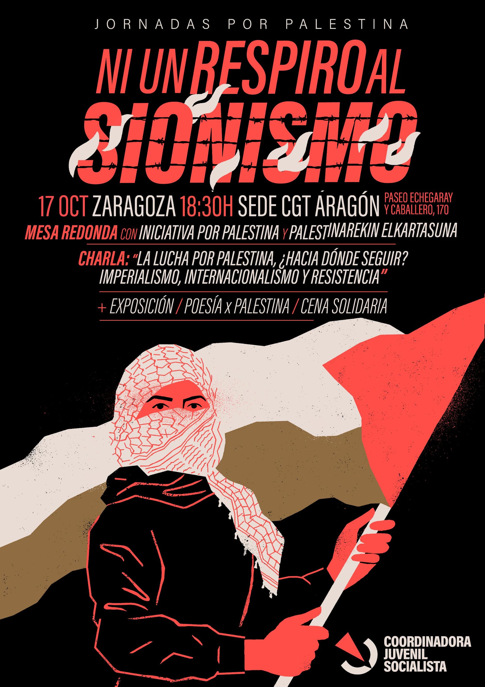 El Ayuntamiento de Zaragoza, gobernado por el Partido Popular (PP) con Natalia Chueca como alcaldesa, ha vetado las jornadas Ni un respiro al sionismo, organizadas por la Coordinadora Juvenil Socialista de Zaragoza (CJS), previstas en un principio para el 17 de octubre en el Centro Cívico Estación del Norte. El evento albergará una mesa redonda con las plataformas Iniciativa por Palestina y Palestinarekin Elkartasuna, un coloquio y un recital de poesía, entre otros. El pasado día 12 de octubre, se celebraron jornadas similares en Madrid y Sevilla.