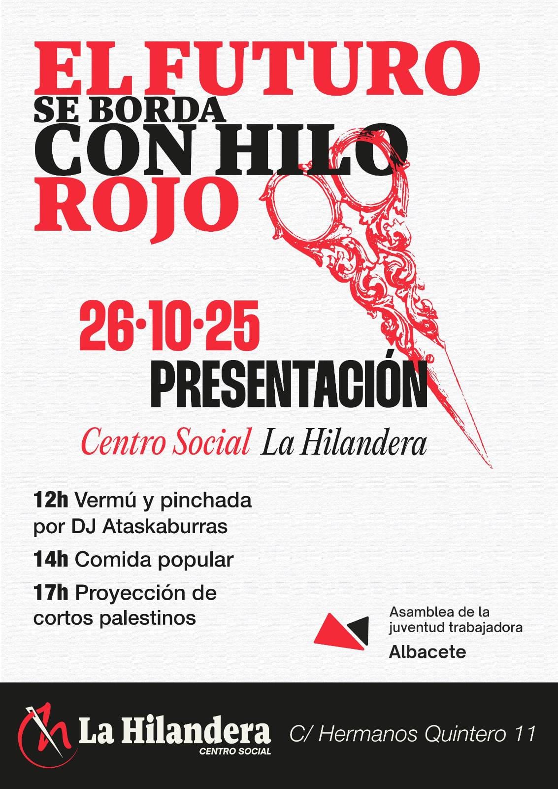La jornada inaugural incluirá una pinchada de DJ Ataskaburras, una comida popular y una proyección de cortos sobre Palestina. La Hilandera quiere ser un punto de partida: un lugar donde la juventud trabajadora vuelva a encontrarse, a organizarse de forma independiente y a romper el aislamiento.