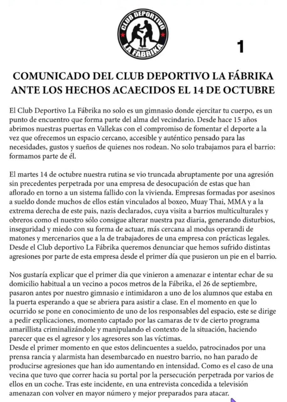 El Club Deportivo La Fábrika, ubicado en el barrio madrileño de Vallecas, denunció el ataque ocurrido el martes 14 de octubre por parte de la empresa de desocupación APD Security, vinculada a grupos fascistas, el ejército israelí y a prácticas violentas. El club, que funciona desde hace 15 años como un espacio comunitario y de entrenamiento, afirmó que durante la mañana de aquel día se produjo un intento de desalojo ilegal a un vecino cercano y que, tras las amenazas previas, varias personas del barrio acudieron en apoyo del gimnasio. Al parecer, la respuesta impidió que pudieran desalojar la casa.