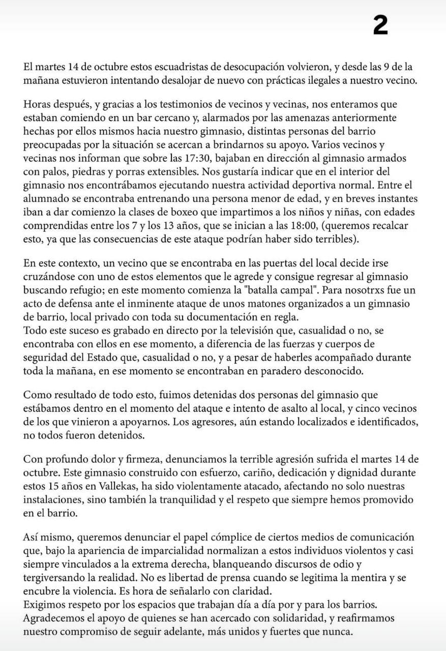 El comunicado detalla que, después del intento de desalojo, alrededor de las 17:30, los agresores se dirigieron al local armados con palos, piedras y porras extensibles, mientras en el interior se desarrollaban actividades deportivas, incluyendo clases de boxeo para niños de 7 a 13 años que comenzarían a las 18:00. Ante la inminencia del ataque, vecinos y trabajadores del gimnasio actuaron en defensa del espacio, lo que derivó en enfrentamientos que fueron grabados en directo por televisión, sin presencia policial en el momento crítico.