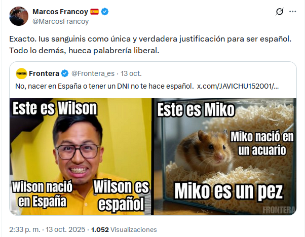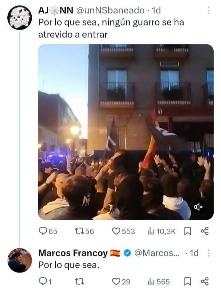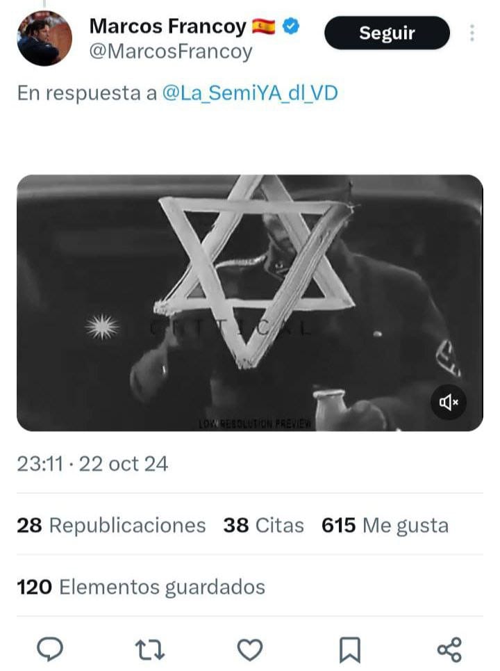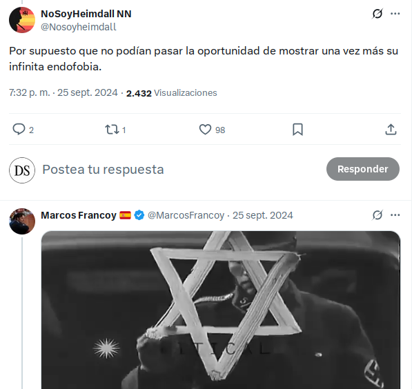 Anteriormente, el 25 de septiembre de 2024, El Mundo publicó una noticia titulada: "Sumar y Bildu viajarán a México para asistir a la toma de posesión de Claudia Sheinbaum", a la que un simpatizante de Núcleo Nacional respondió en X: "Por supuesto que no podían pasar la oportunidad de mostrar una vez más su infinita endofobia". Francoy le respondió publicando la misma imagen del nazi de las SA pintando la estrella de David.