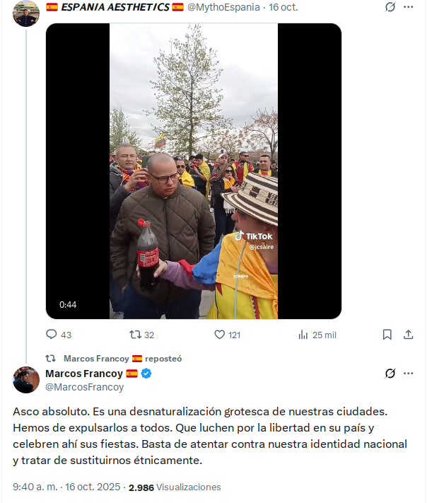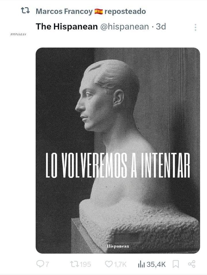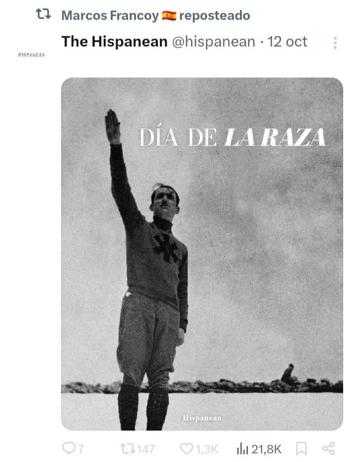 Entre algunos de los contenidos que ha compartido el cargo de Vox destacan una imagen del fundador de las JONS, Ramiro Ledesma Ramos, haciendo el saludo fascista bajo el lema Día de la Raza (12 de octubre de 2025), y un busto de José Antonio Primo de Rivera acompañado del texto Lo volveremos a intentar (16 de octubre de 2025). En otra publicación que data del mismo día, escribió: “De ahí que sea profundamente importante combatir con cualquier medio posible el reemplazo étnico al que nos someten, remigrar a todos los no españoles de sangre y promover políticas que permitan la natalidad de los españoles autóctonos”.
