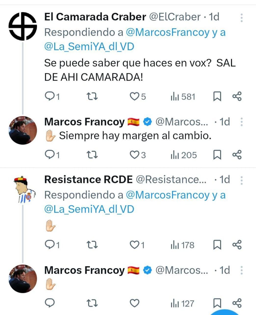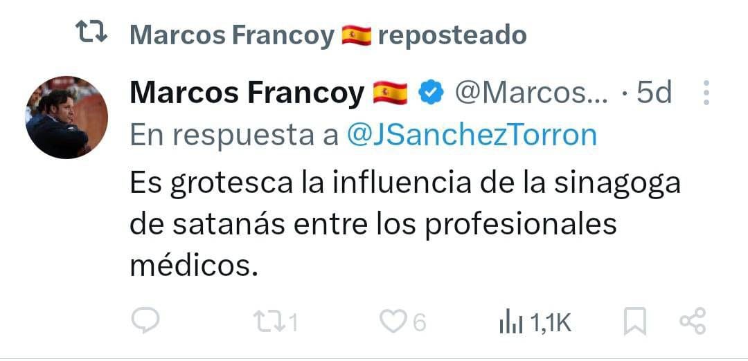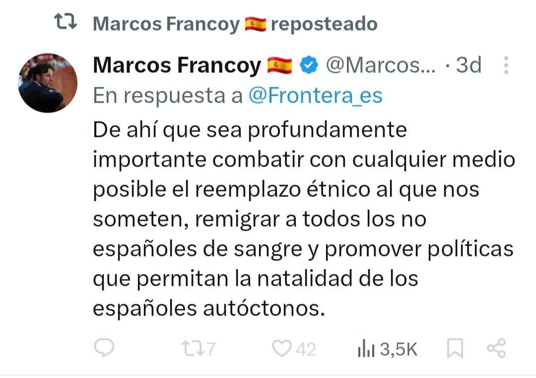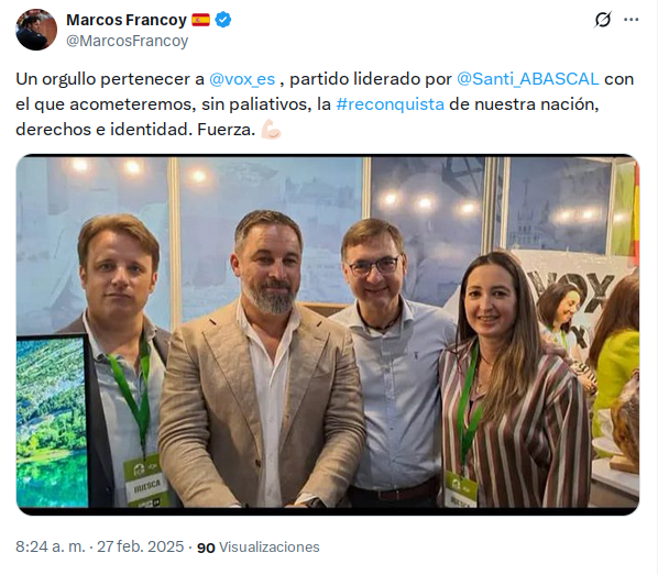 Marcos Francoy, Asesor Parlamentario de Vox en las Cortes de Aragón, Vocal y Responsable de Organización Territorial de Vox Huesca, excandidato al senado en 2023 y responsable de relaciones institucionales de Vox Huesca en 2024, ha difundido desde su cuenta personal de X (anteriormente Twitter) una serie de publicaciones con referencias nazis y mensajes abiertamente racistas y judeófobos.