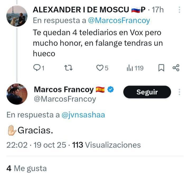 El asesor y responsable de organización de Vox en Aragón ha interactuado públicamente y de forma amistosa con más cuentas neonazis y fascistas, como un usuario que el 19 de octubre difundía un vídeo de una concentración del grupo neonazi Núcleo Nacional, donde afirmaba: "Por lo que sea, ningún guarro se ha atrevido a entrar", al que Francoy respondió con un irónico “Por lo que sea”. A otro usuario que le preguntaba sobre su militancia en Vox y le invitaba a unirse a Falange en un futuro, el miembro de Vox contestó “Gracias”, junto al emoticono que emulaba un saludo fascista.